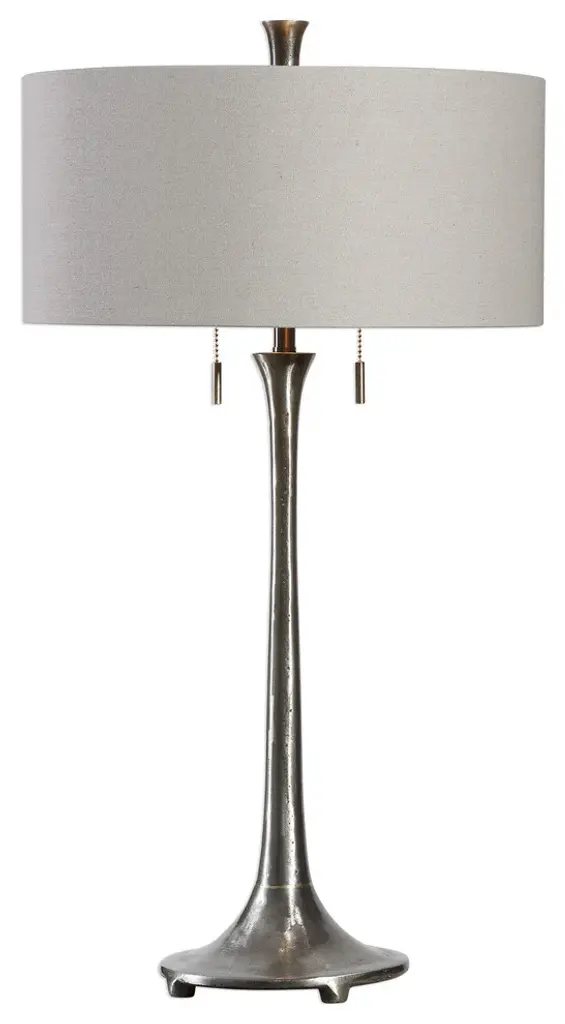 This Sleek Tapered Design Is Solid Cast Iron With A Subtle Porous Texture, Sealed To Preserve The Natural Finish, Accented With Gold Infused Highlights. The Round Hardback Drum Shade Is A Gray Linen Fabric With Natural Slubbing.- 17" dia x 31.5"H. Weighs 10 lbs.- Handcrafted Cast Iron with Fabric Shade- UL Listed. Uses two max 60W Type A bulbs (not included). On/Off Switch- Heirloom Quality - Expertly hand crafted and hand finished. Due to the hand crafted nature of this piece, each piece may have subtle differences.