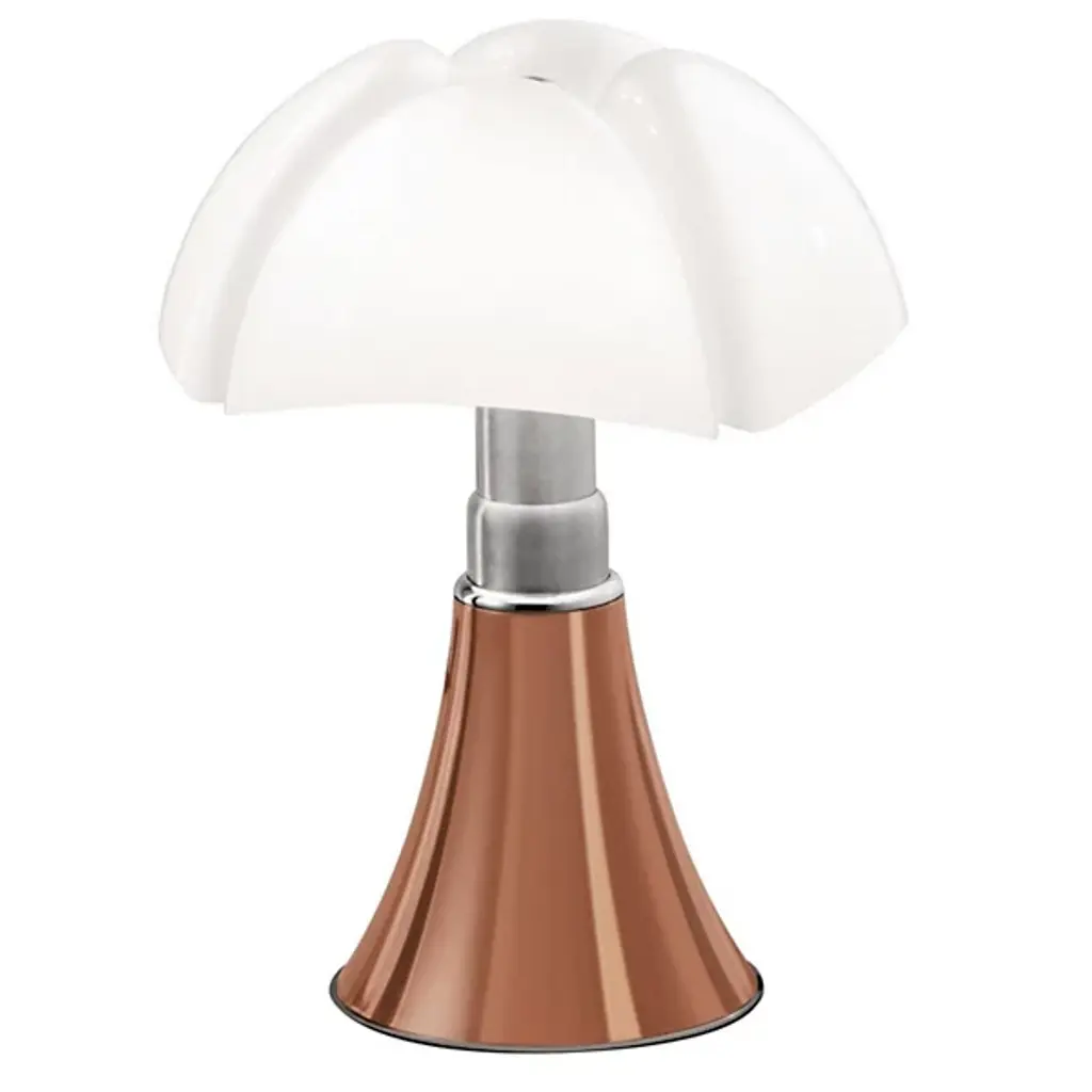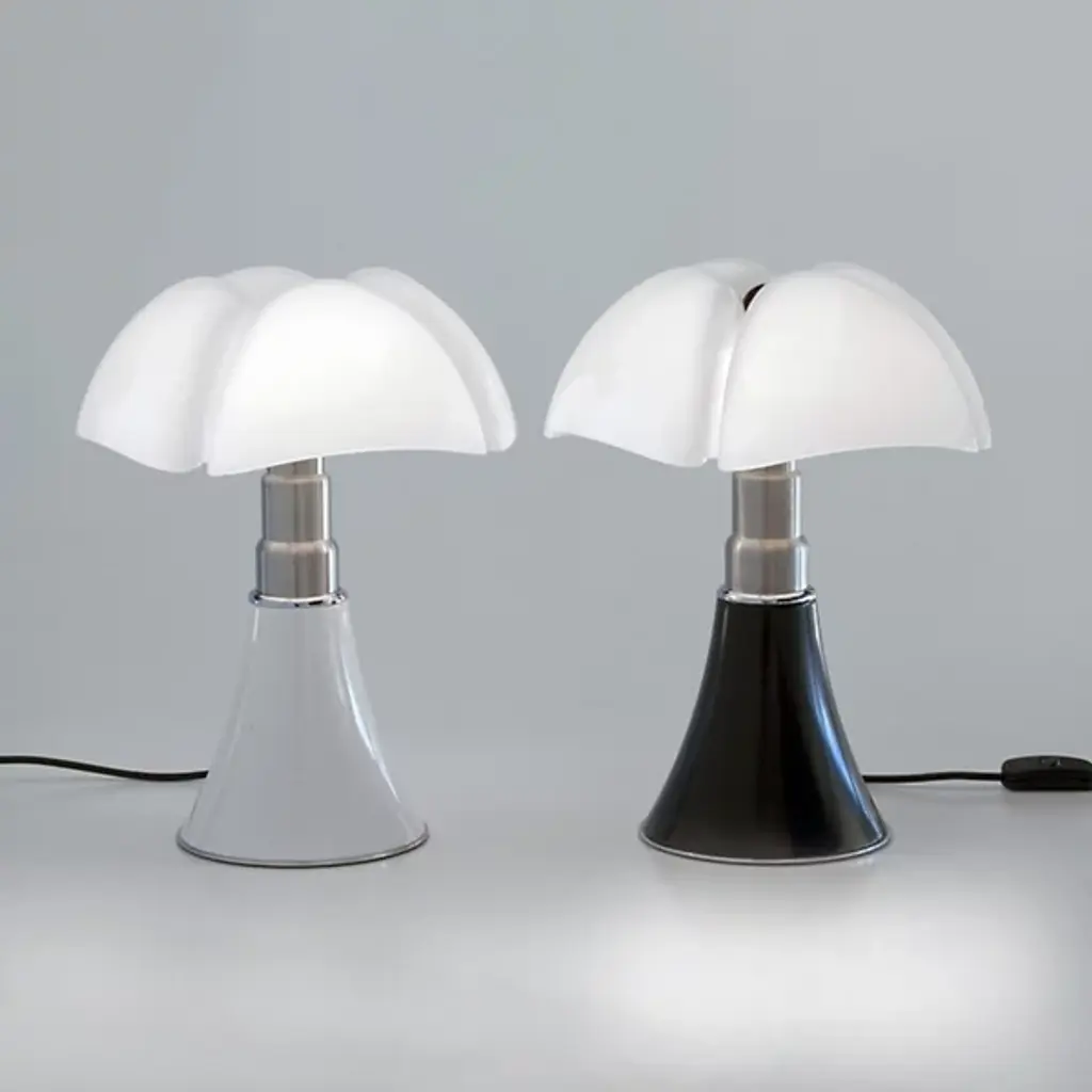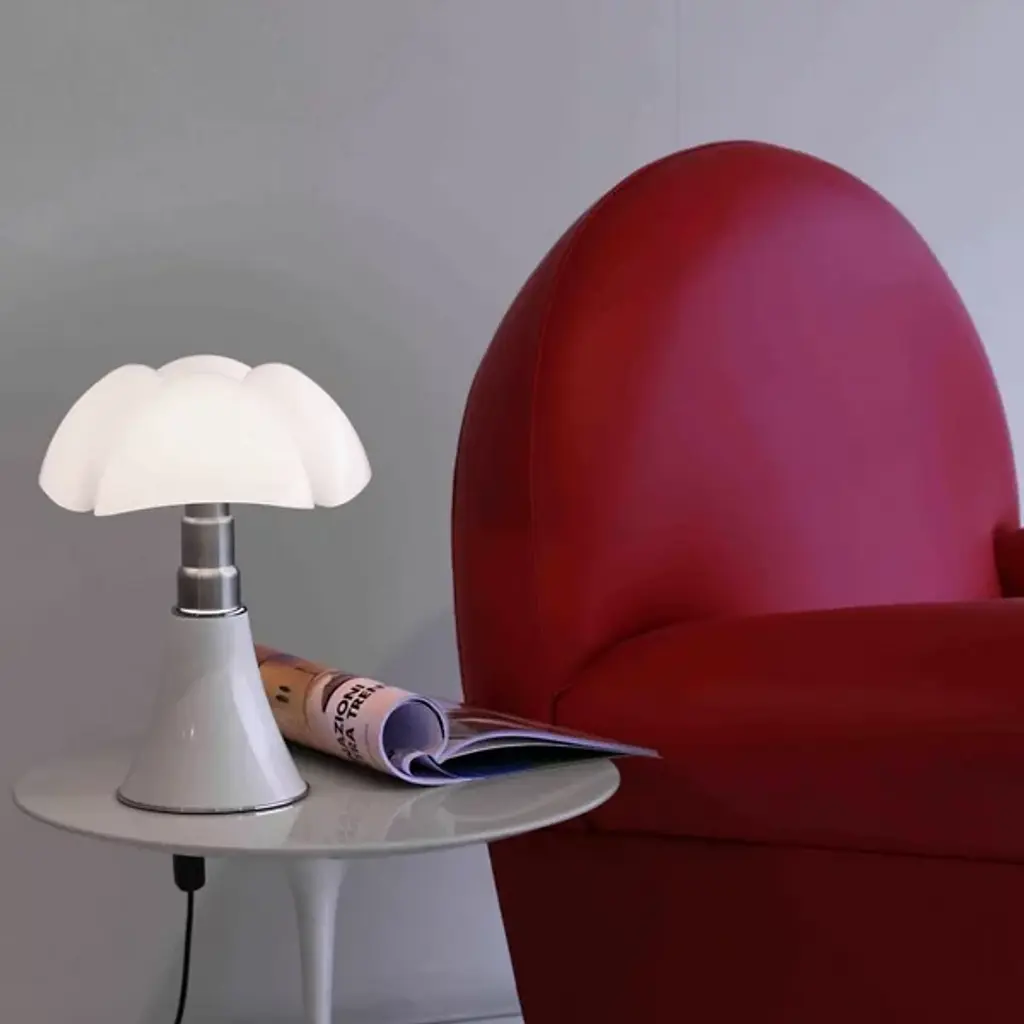 The Minipipistrello LED Table Lamp by Martinelli Luce effortlessly combines refined style with whimsical charm. Designed in 1965 by Gae Aulenti, this lively fixture has been updated to suit the needs of modern lighting while maintaining its original flair. Evoking the look of a floating dandelion seed, Aulenti drew inspiration from floating and flying figures; its white opal shade alludes to wings spread open. A telescope-style neck and conical base create an eye-catching combination of silhouettes to accent room or office.