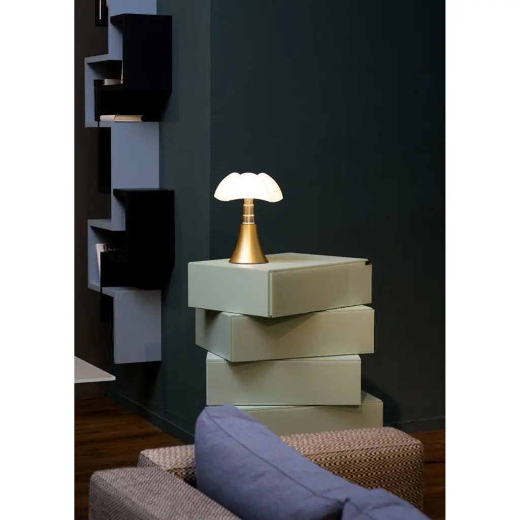 Minipipistrello by Martinelli Luce is a whimsical table lamp created by the Italian designer Gae Aulenti in 1965. The name of the luminaire comes from the Italian word for ”a bat”, pipistrello, and alludes to the playful and distinctive shape of the opal white shade that resembles the wings of a bat. The subtle cheerfulness of the luminaire is just as at home on top of a sideboard, desk or nightstand, and Minipipistrello also makes a lovely window light. The height of the mini-sized Pipistrello lamp is 13.78 x 0 in (35 x cm. cm).