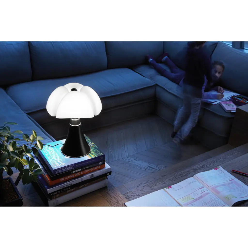 Minipipistrello by Martinelli Luce is a whimsical table lamp created by the Italian designer Gae Aulenti in 1965. The name of the luminaire comes from the Italian word for ”a bat”, pipistrello, and alludes to the playful and distinctive shape of the opal white shade that resembles the wings of a bat. The subtle cheerfulness of the luminaire is just as at home on top of a sideboard, desk or nightstand, and Minipipistrello also makes a lovely window light. The height of the mini-sized Pipistrello lamp is 13.78 x 0 in (35 x cm. cm).