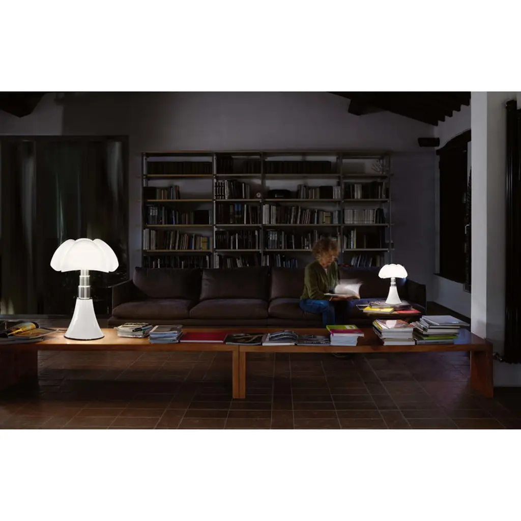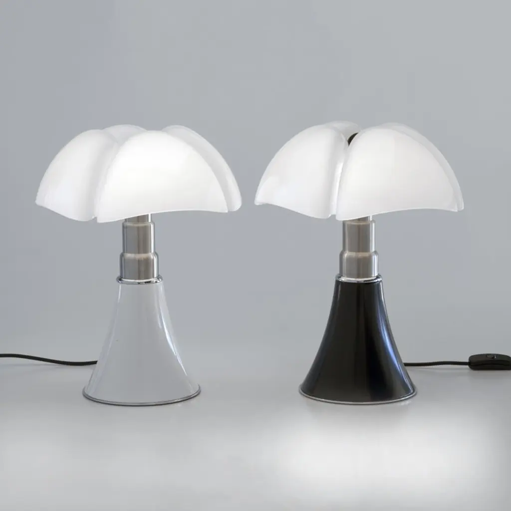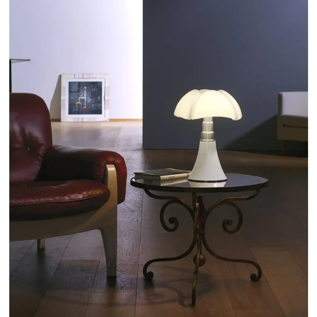 Minipipistrello by Martinelli Luce is a whimsical table lamp created by the Italian designer Gae Aulenti in 1965. The name of the luminaire comes from the Italian word for ”a bat”, pipistrello, and alludes to the playful and distinctive shape of the opal white shade that resembles the wings of a bat. The subtle cheerfulness of the luminaire is just as at home on top of a sideboard, desk or nightstand, and Minipipistrello also makes a lovely window light. The height of the mini-sized Pipistrello lamp is 13.78 x 0 in (35 x cm. cm).
