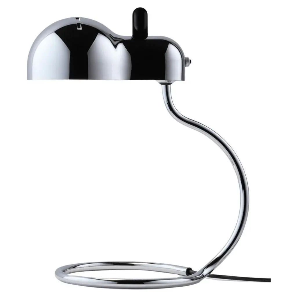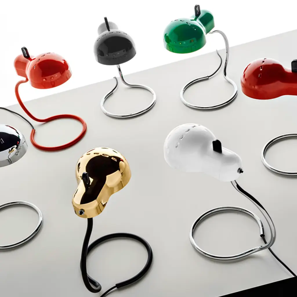 Minitopo is a fascinating object of automotive inspiration: the slits on the body are reminiscent of the vents on a 1960s sports car, whilst the lampshade’s form corresponds to the shell of the classic E27 bulb it contains, like the bodywork covering an engine. The resulting form resembles a little mouse (or, ‘topo’ in Italian), hence the metallic name. The light is can be directed via the black handle, which represents the mouse’s tail, positioned on the light reflector.