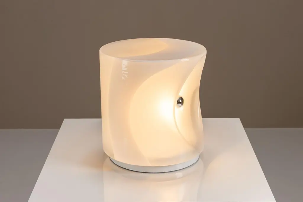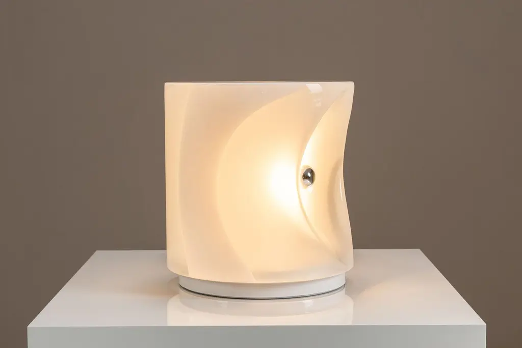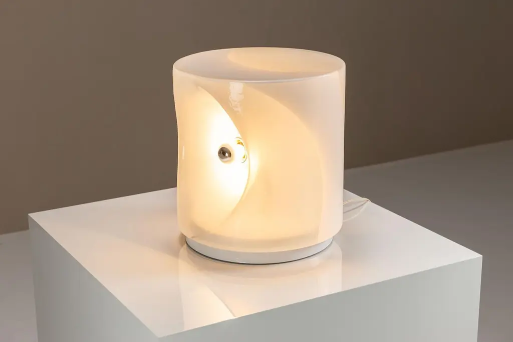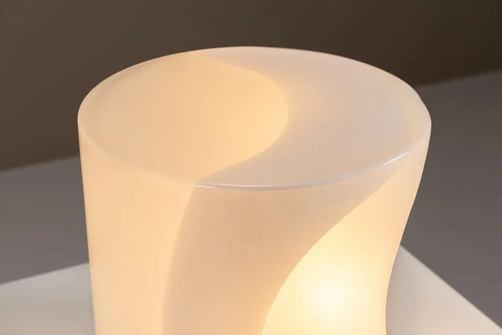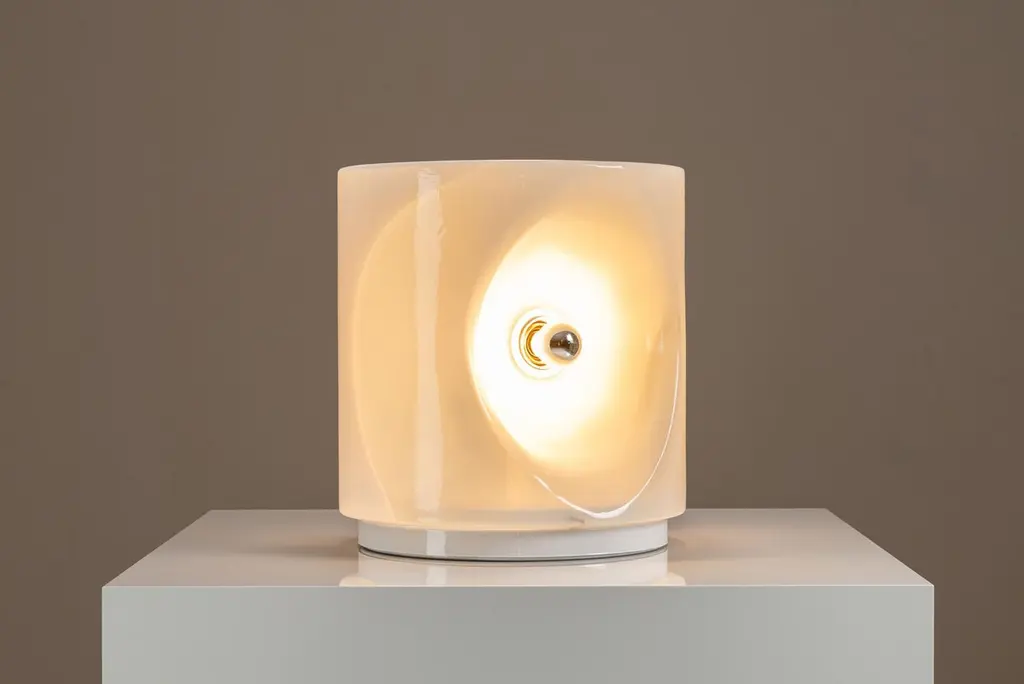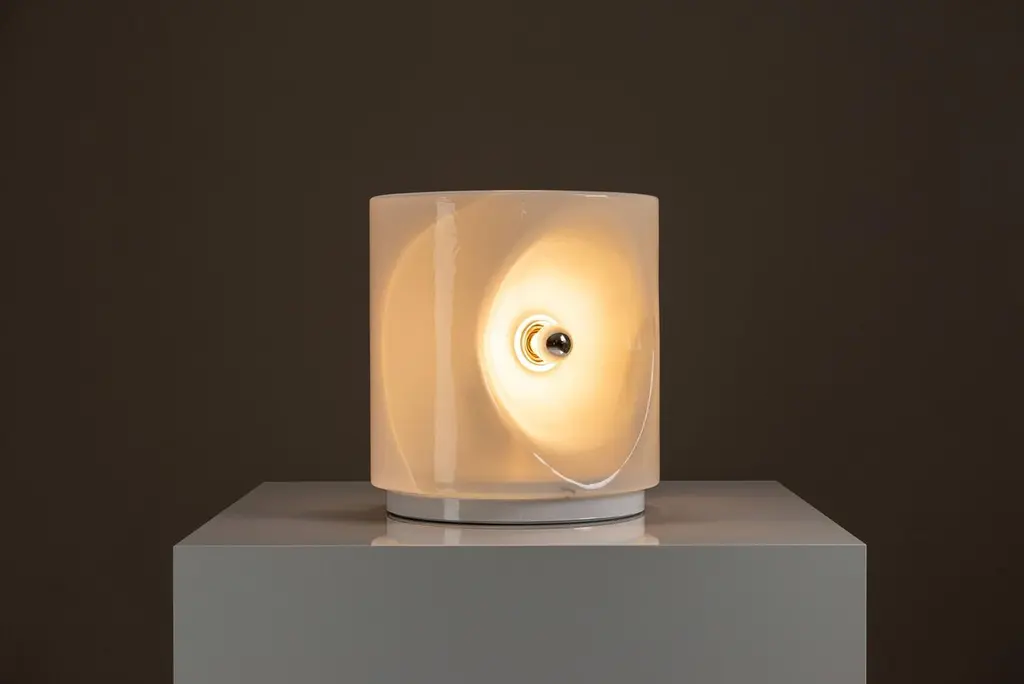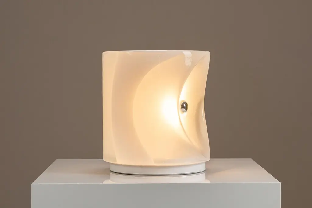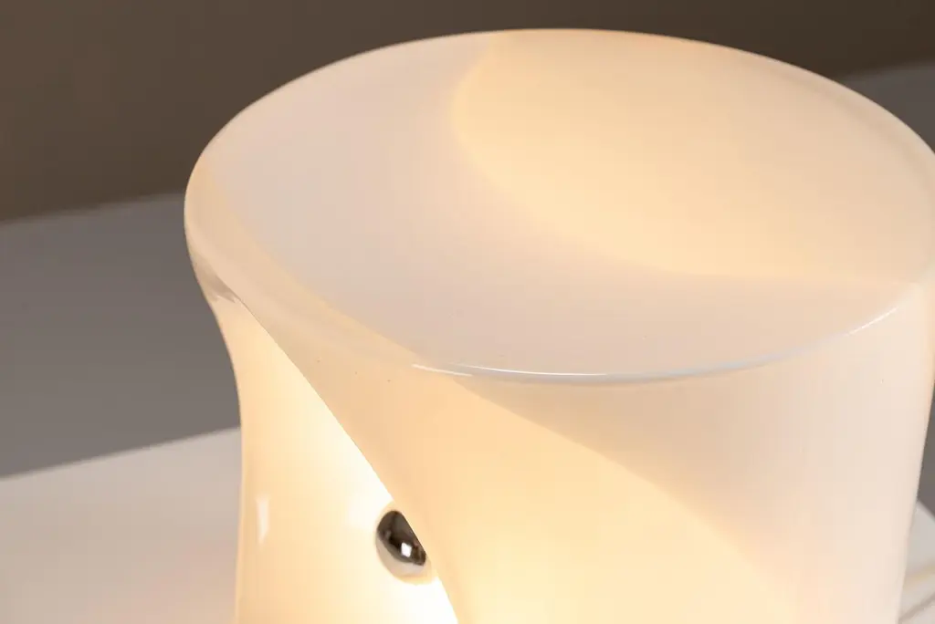 Carlo Nason’s Minosse table lamp for Linea GB embodies the designer’s talent for transforming Murano glass into sculptural forms of light. Originating in the 1960s, this model is documented in a Linea GB leaflet of the period, reproduced in the Carlo Nason book Handle with Care.DesignThe lamp presents a cylindrical glass body with a subtle twist that gives it a sense of movement and depth. Its satin-white Murano glass diffuses a warm, even glow, while the sculpted concave indentation draws the eye towards a polished chrome sphere at the centre.Nason’s approach was to treat light not as a static source but as a medium that interacts with form and material. The Minosse rests on a discreet circular base, providing balance without disturbing the visual purity of the design. Functional as a table lamp yet sculptural in presence, it illustrates the Italian search for modernity in lighting during the 1960s.ConditionThis lamp is in very good vintage condition, with only minor traces of age. The glass is free from cracks or significant wear, and the electrical system remains in working order.