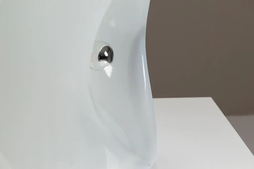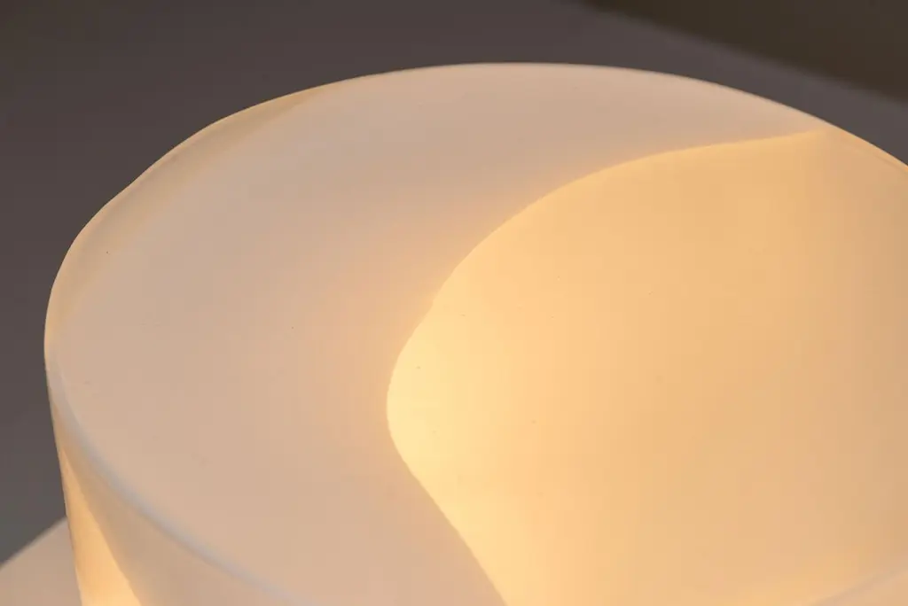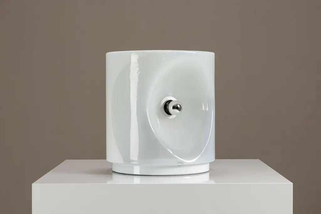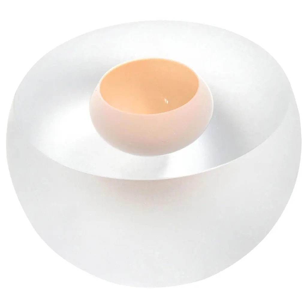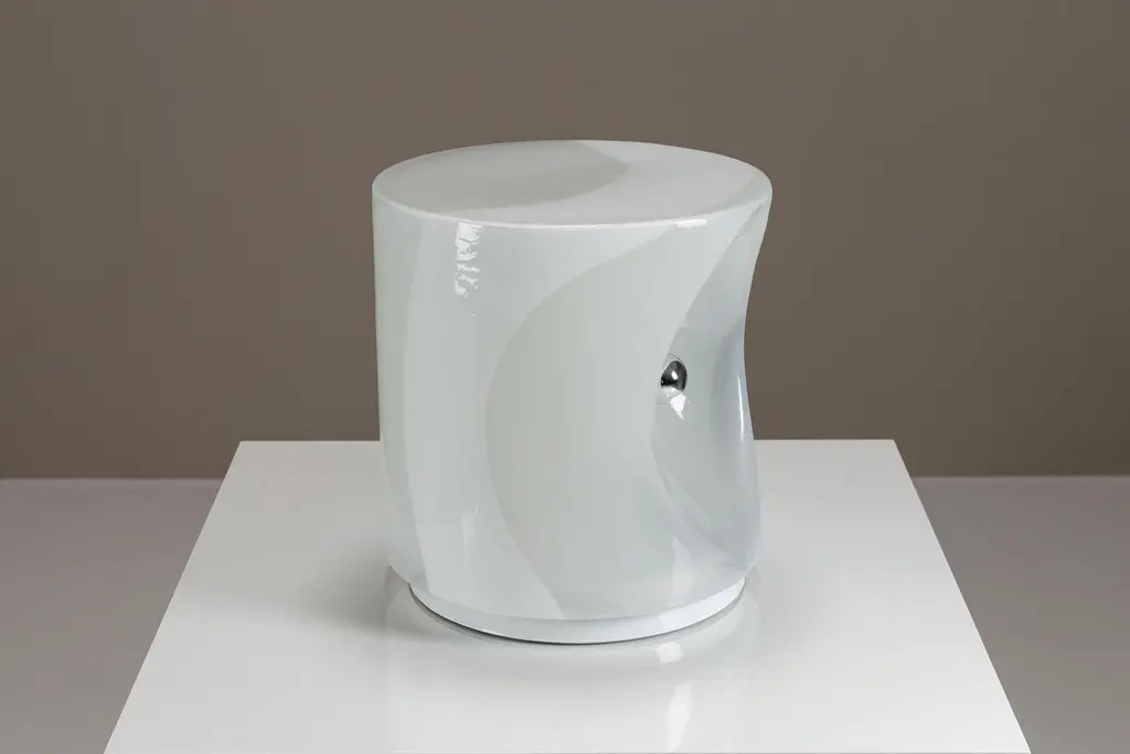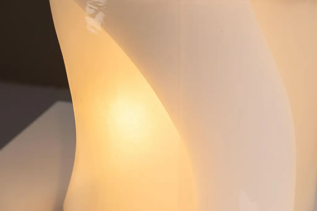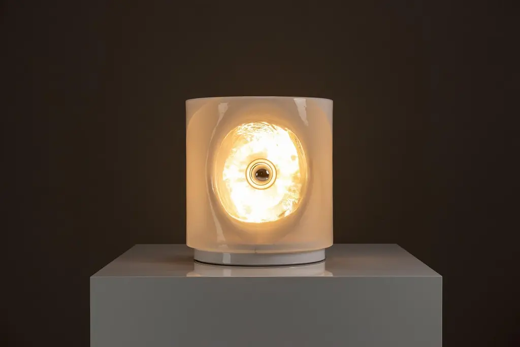 Carlo Nason’s Minosse table lamp for Linea GB embodies the designer’s talent for transforming Murano glass into sculptural forms of light. Originating in the 1960s, this model is documented in a Linea GB leaflet of the period, reproduced in the Carlo Nason book Handle with Care.DesignThe lamp presents a cylindrical glass body with a subtle twist that gives it a sense of movement and depth. Its satin-white Murano glass diffuses a warm, even glow, while the sculpted concave indentation draws the eye towards a polished chrome sphere at the centre.Nason’s approach was to treat light not as a static source but as a medium that interacts with form and material. The Minosse rests on a discreet circular base, providing balance without disturbing the visual purity of the design. Functional as a table lamp yet sculptural in presence, it illustrates the Italian search for modernity in lighting during the 1960s.ConditionThis lamp is in very good vintage condition, with only minor traces of age. The glass is free from cracks or significant wear, and the electrical system remains in working order.
