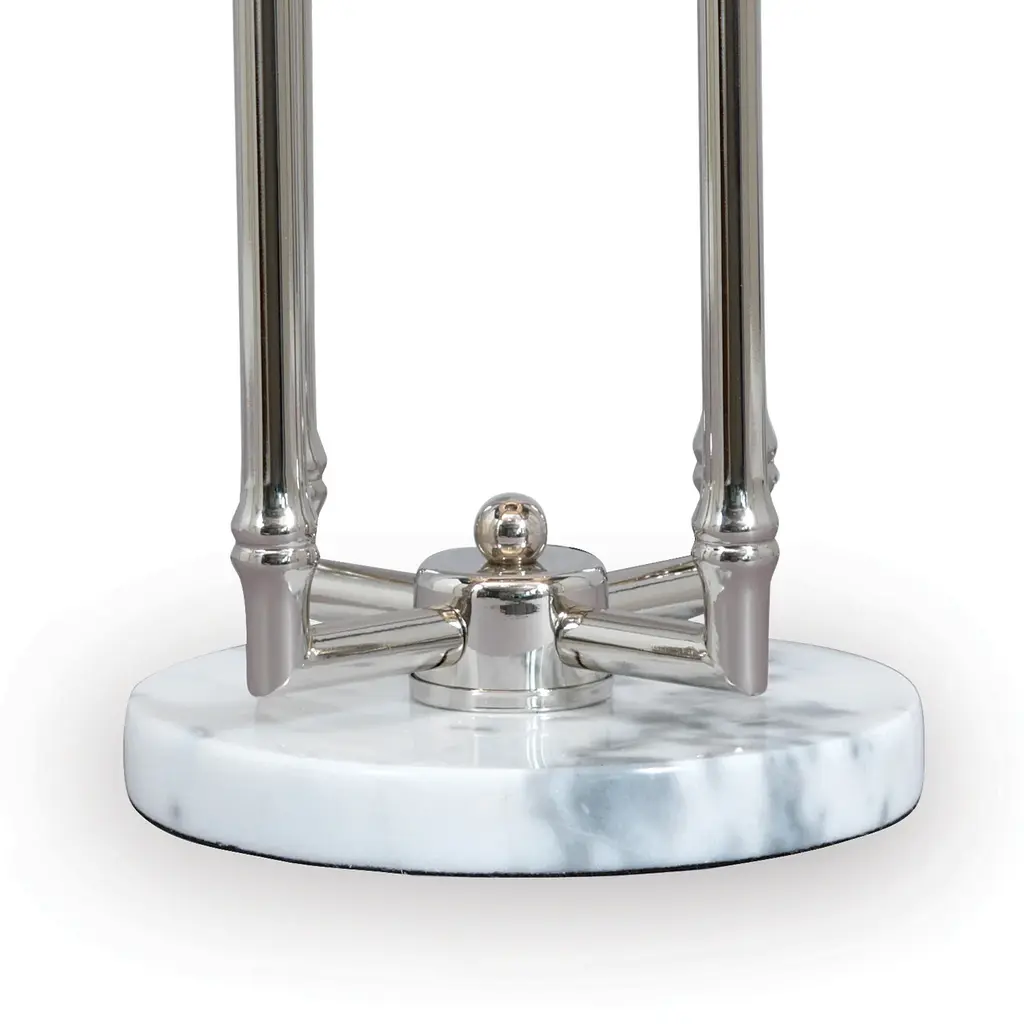 In the style of 70's Hollywood glamour, our Miramar lamp marries polished nickel metal bamboo and a hand polished white marble base. Metal ball finial.