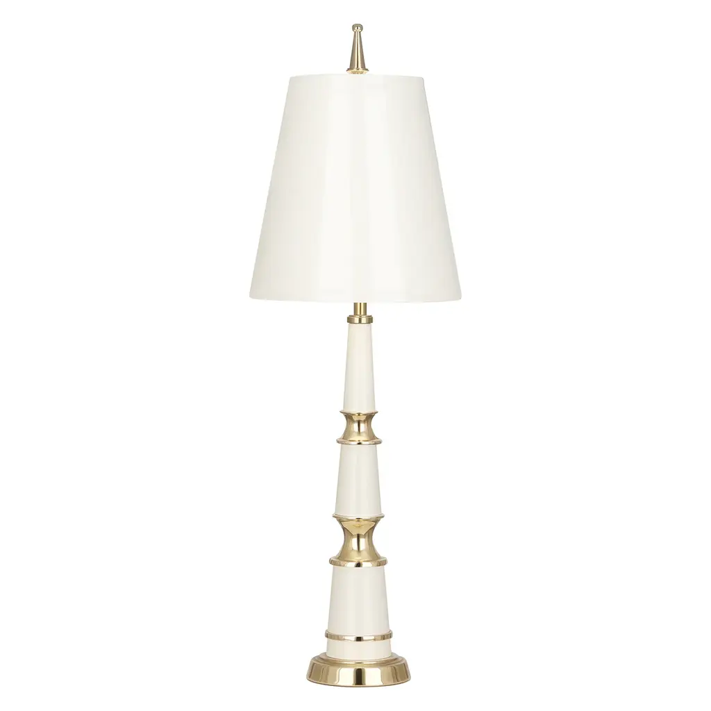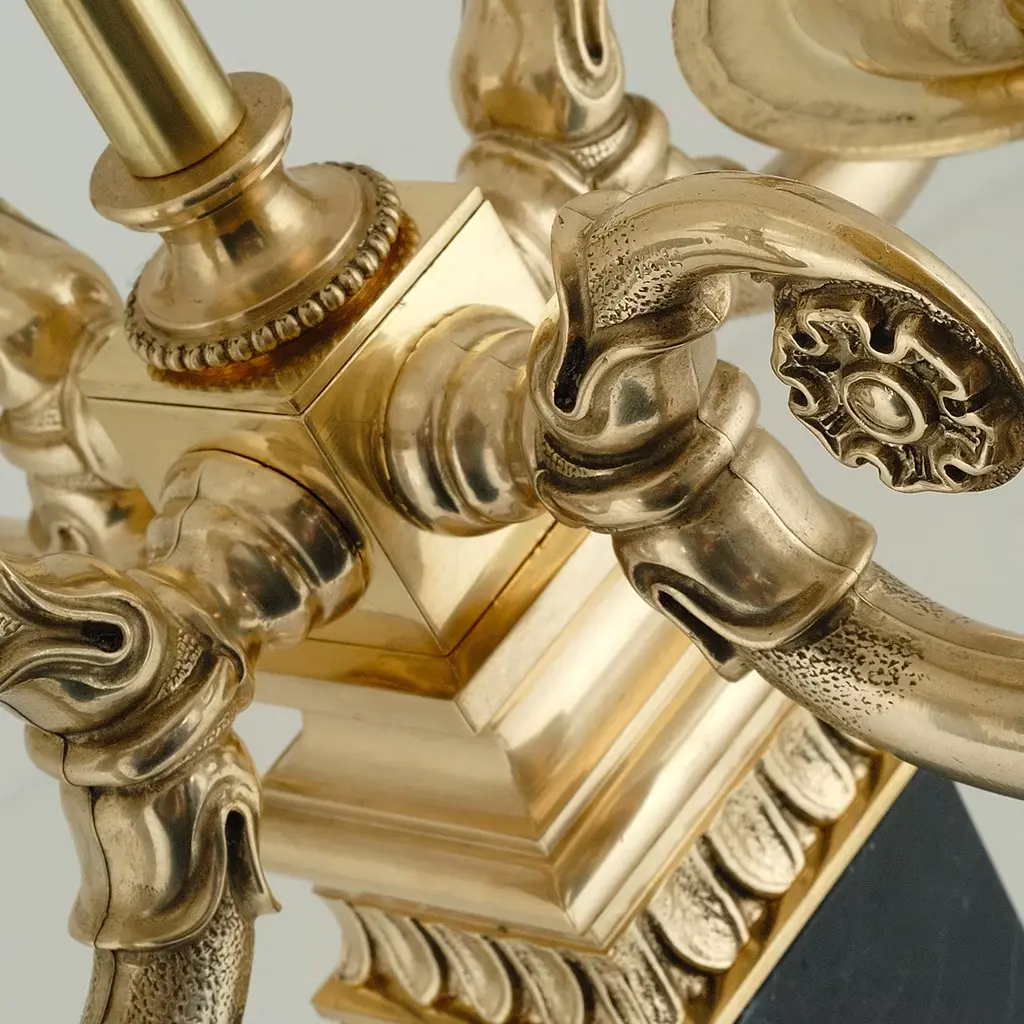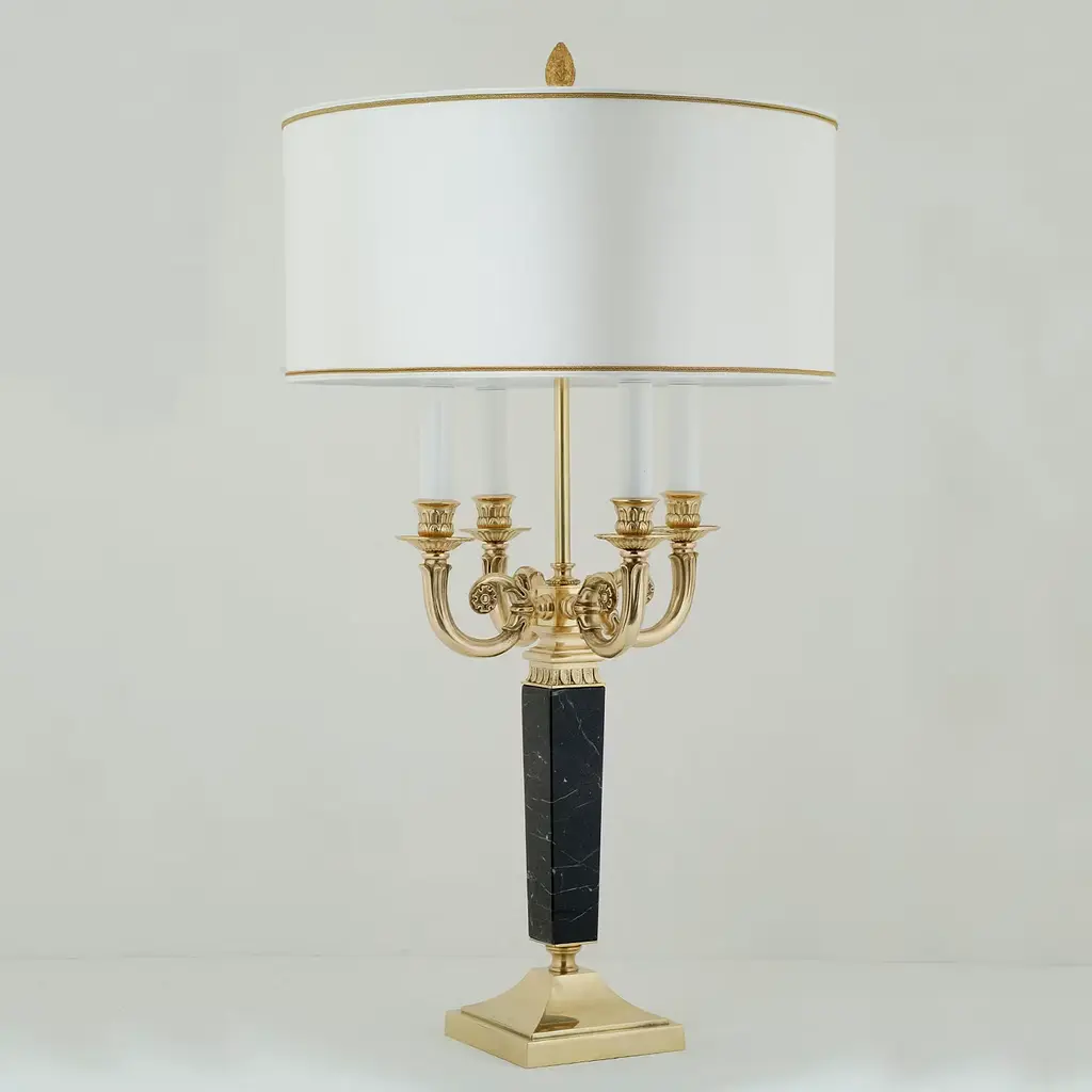 A perfect accent for mid-century and traditional interiors alike, this table lamp showcases a candelabra-inspired design with a cylindrical shade in white fabric with golden rims. The square base tapers towards the superb stem crafted of black marble that supports four scrolled arms with white candle sleeves and flared bobeche. The polished finish of the brass structure adds a shimmering touch that enhances the classic inspiration of this sophisticated piece. Elegantly diffusing light, this table lamp will be a bold statement with a twin flanking a couch in a living room. Holds four E27 bulbs.