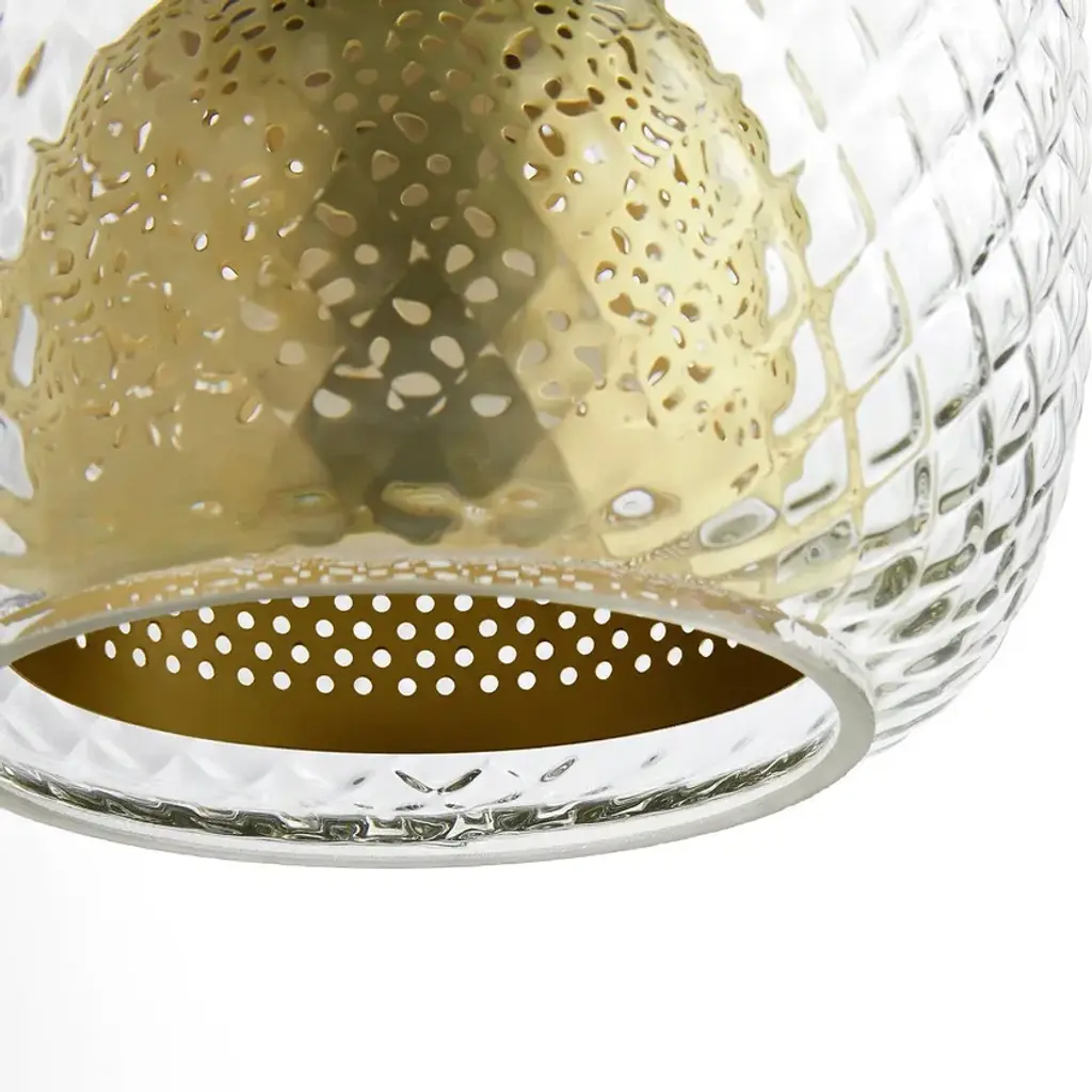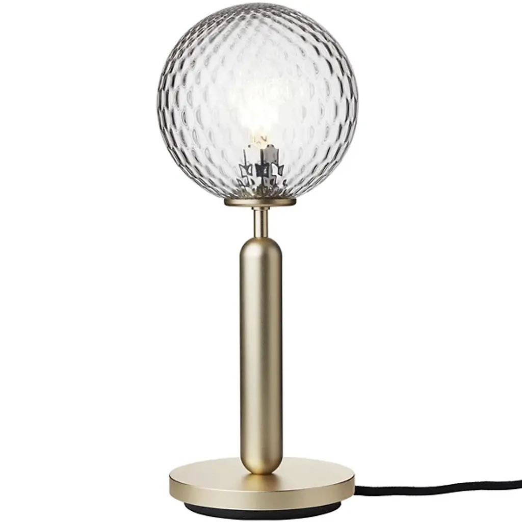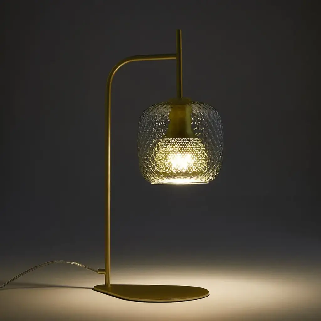 Mistinguett table lamp, an Emmanuel Gallina creation, exclusively for AM.PM. The combination of brushed brass with chiselled glass is inspired by the art deco movement where the elegance of the line emphasises the nobility of the materials. Between the perforated metal diffuser and glass globe, a play of light emerges with sweet and timeless notes.E14 lamp holder for 40W bulb (not included).Compatible with energy class A, B, C, D, E bulbs.