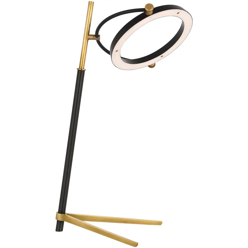 The Mistral Medium Ring LED Table Lamp from Visual Comfort Signature is designed by Ian K. Fowler. Crafted from premium brass and steel, it radiates elegance. This durable table lamp accentuates your space with its lovely ring formation and distinctive forked base. Beyond its captivating design, this lamp boasts dimming capabilities, featuring an ELV base touch dimmer for a customized ambiance. A fine metal rod keeps the table lamp steady.