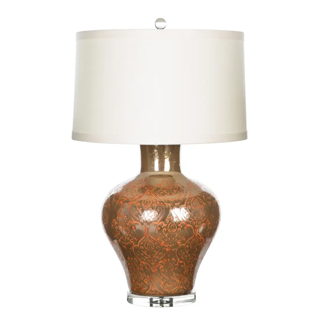 The Mithran Table Lamp is an opulent decorative accent crafted from glazed porcelain. This stylish white lamp is adorned in fired gold florals with intricate detailing, matched by a large Brushed Brass lid etched with textural grooves in a wavy pattern. The piece features brass hardware and an artistic ball finial, matching the design of the body, as well as a round white linen shade with rolled edges.