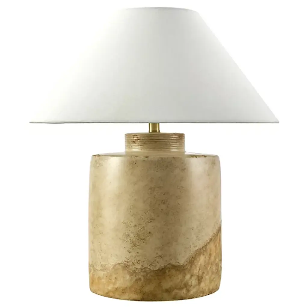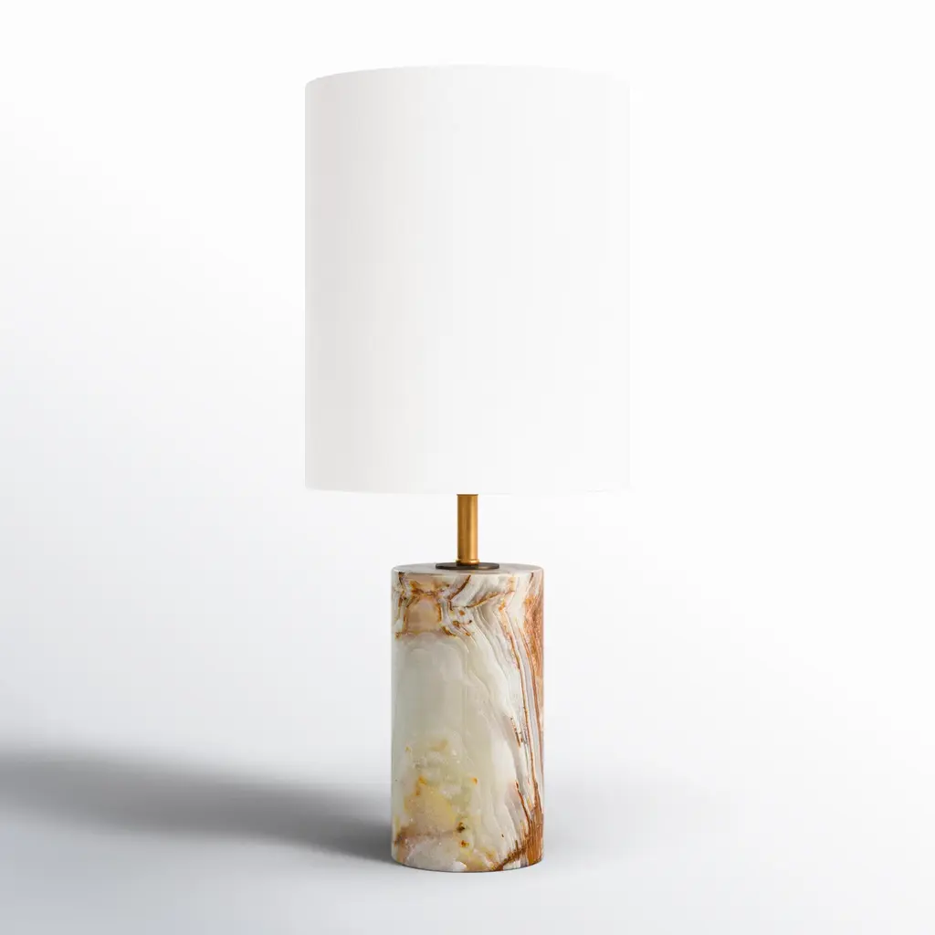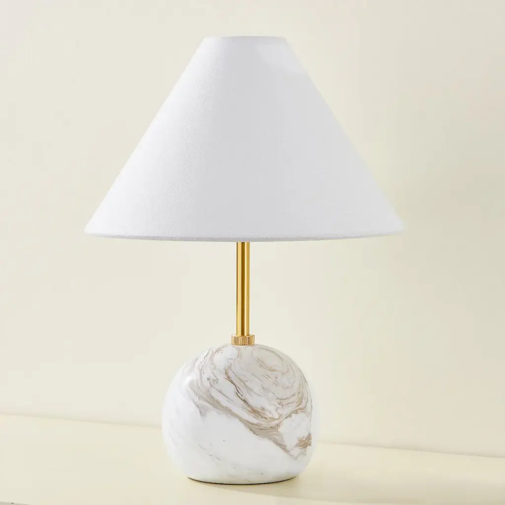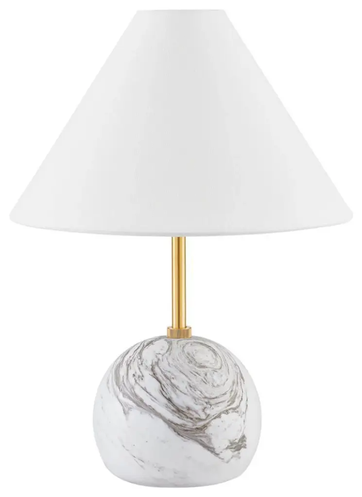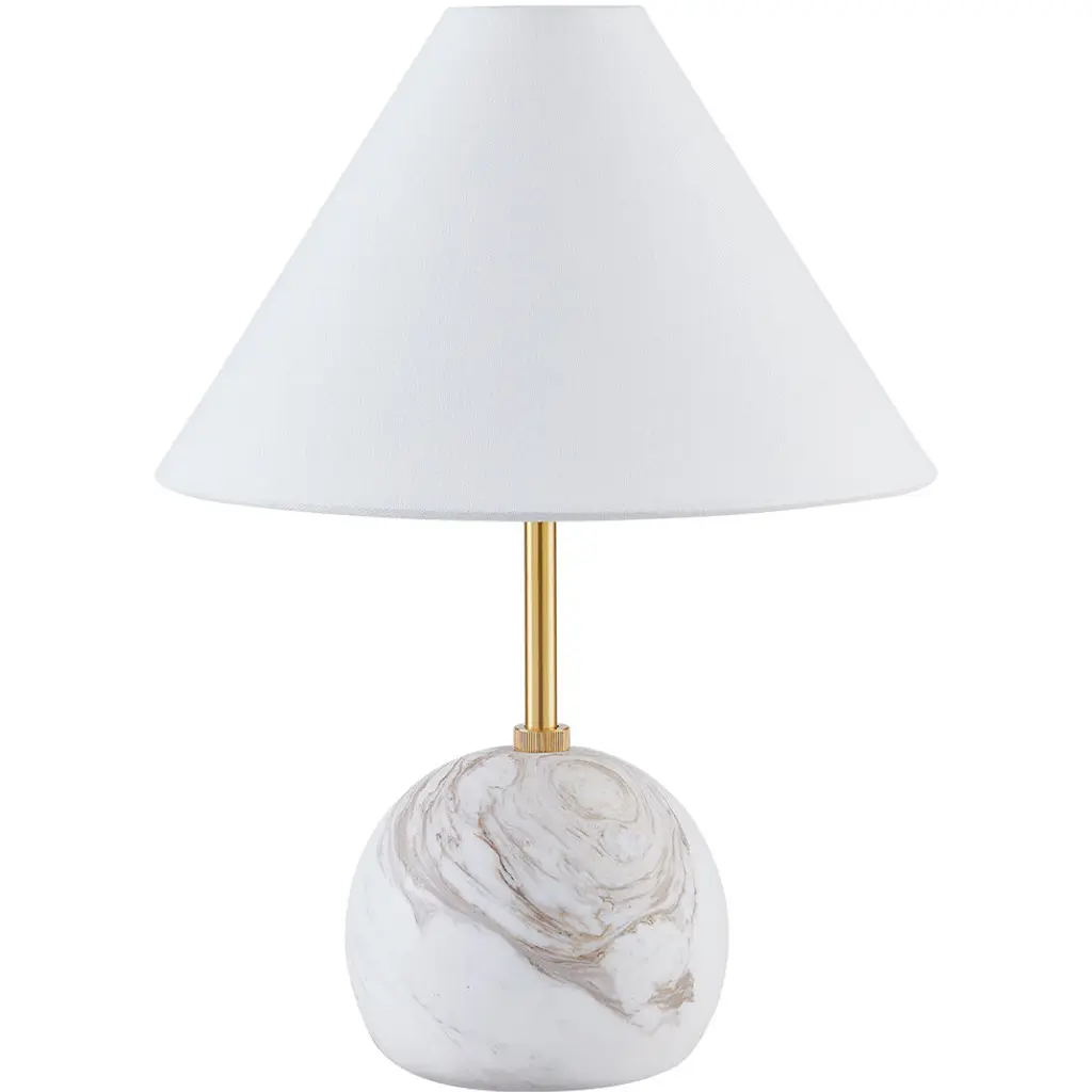 Petite, yet statuesque, Jewel marries distinctive materials and geometric shapes. Sculpted from honed Calcutta gold marble, the spherical body supports a sleek, elongated neck in Aged Brass. A tapered white linen shade tops this table lamp, bringing texture to any space. • Due to the one-of-a-kind nature of the medium, exact colors and patterns may vary slightly from the image shown.Features:• High-quality steel construction ensures durability and long-lasting use• Compatible with E26 medium base bulbs for versatile lighting options• Powerful 8W integrated LED delivers consistent and efficient illumination• Includes ON/OFF switch for simple and immediate lighting control• Dry location listed, ensuring safe performance in compatible environments• 1 year limited manufacturer warranty for your peace of mindDimensions:Table Lamp• Assembled Product: 11.75 inches wide x 11.75 inches deep x 16 inches high• Shade Depth: 11.75 inches• Shade Height: 7 inches• Shade Width: 11.75 inchesAdditional Dimensions• • Requirements:• Installation Required: No• Maximum Individual Bulb Wattage: 8 watts• Maximum Voltage: 120 volts• Integrated LED Wattage: 8 watts