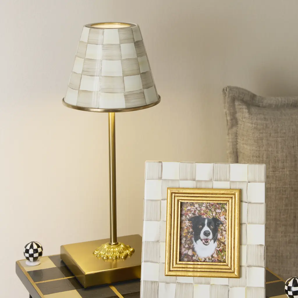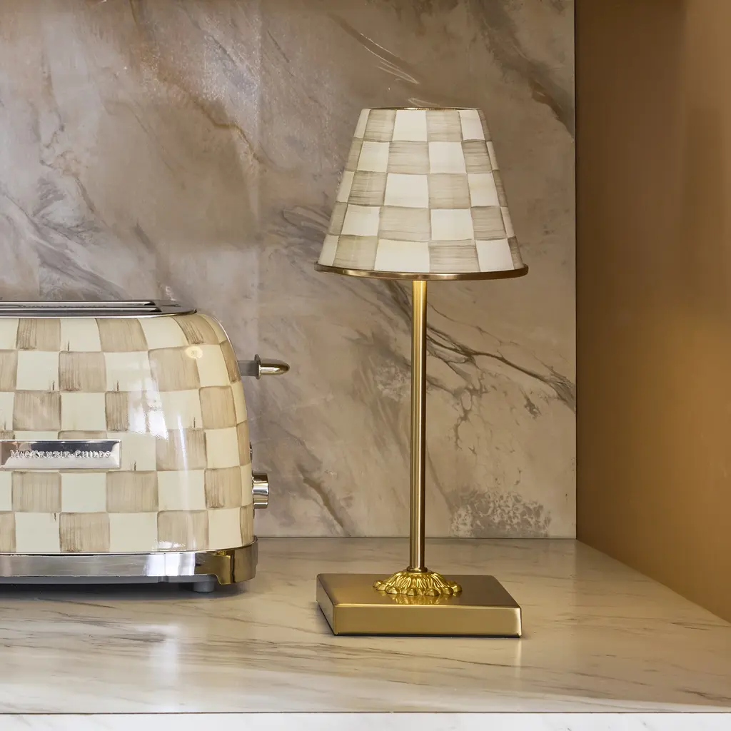 Illuminate your style with this Mocha Check LED Rechargeable Cafe Table Lamp. Add a bit of MacKenzie-Childs style to any surface, from the table at an outdoor dinner party to your bathroom vanity ambiance for your nightly bubble bath. With three light levels, you can choose the right mood for any occasion. Style it with Sterling, Rosy, Royal, or our beloved Courtly Checks!