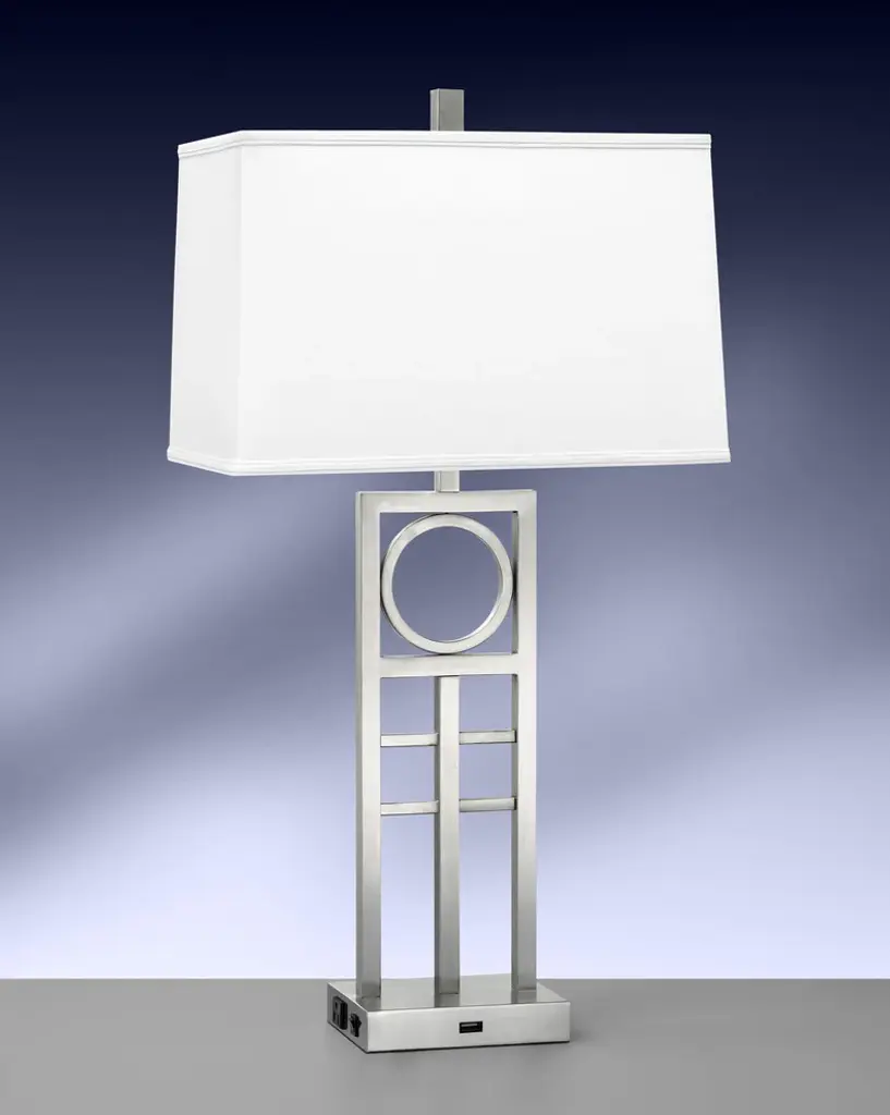 Light up your bedroom or living room style with this striking modern table lamp. Its simple, sleek post is designed with an open square and hand-painted in a textured champagne or black finish for a lustrous, graphic style. Simply elegant and versatile, Modena delivers unmistakable style with visual airiness.