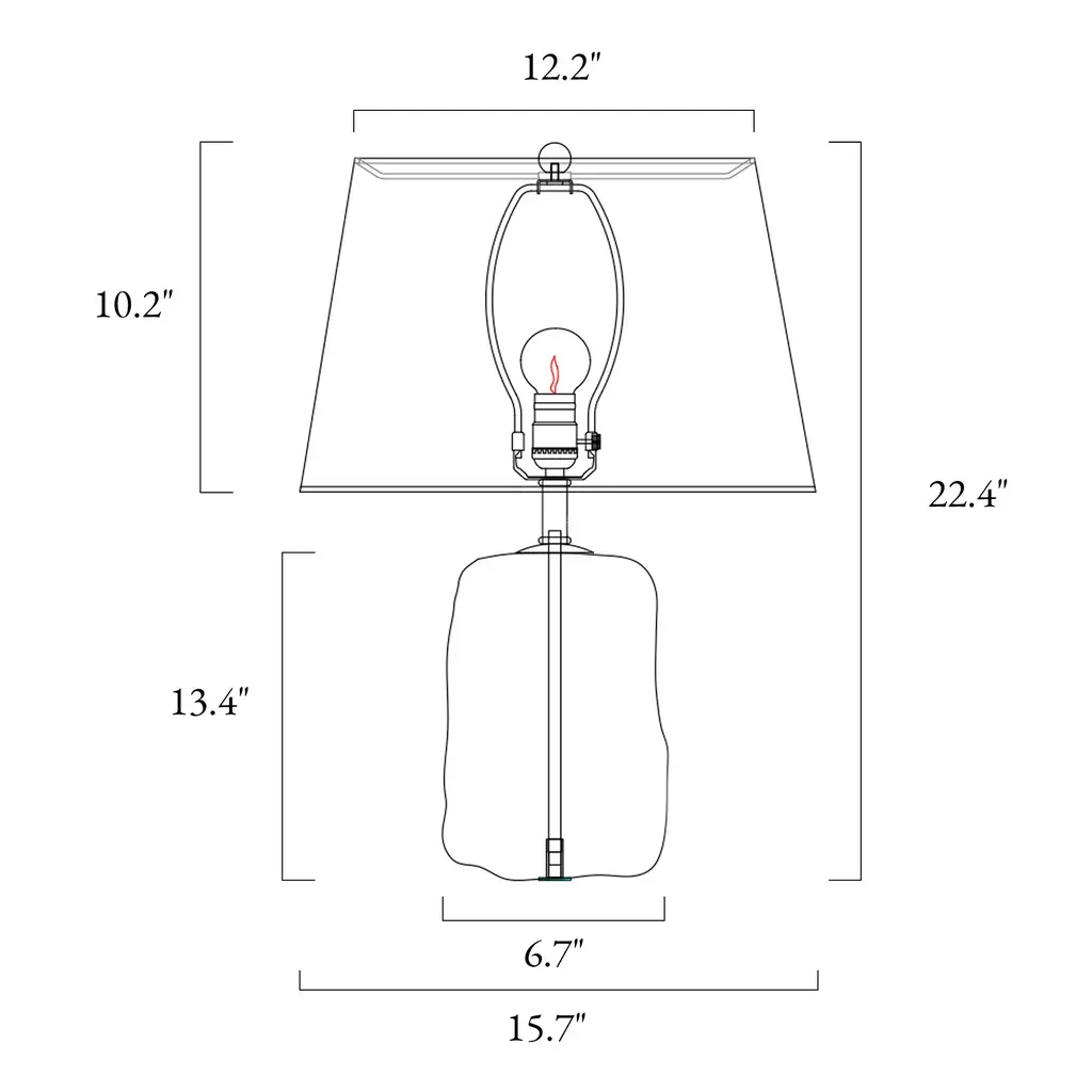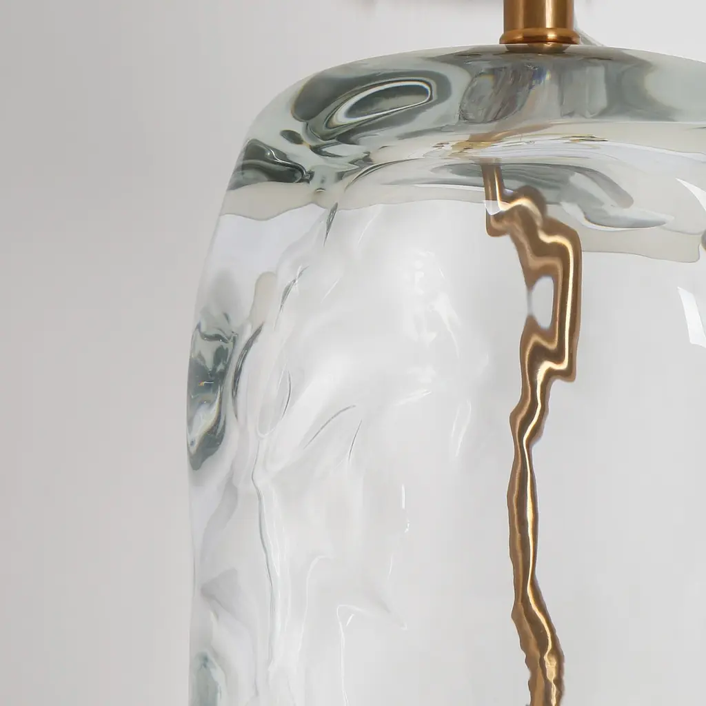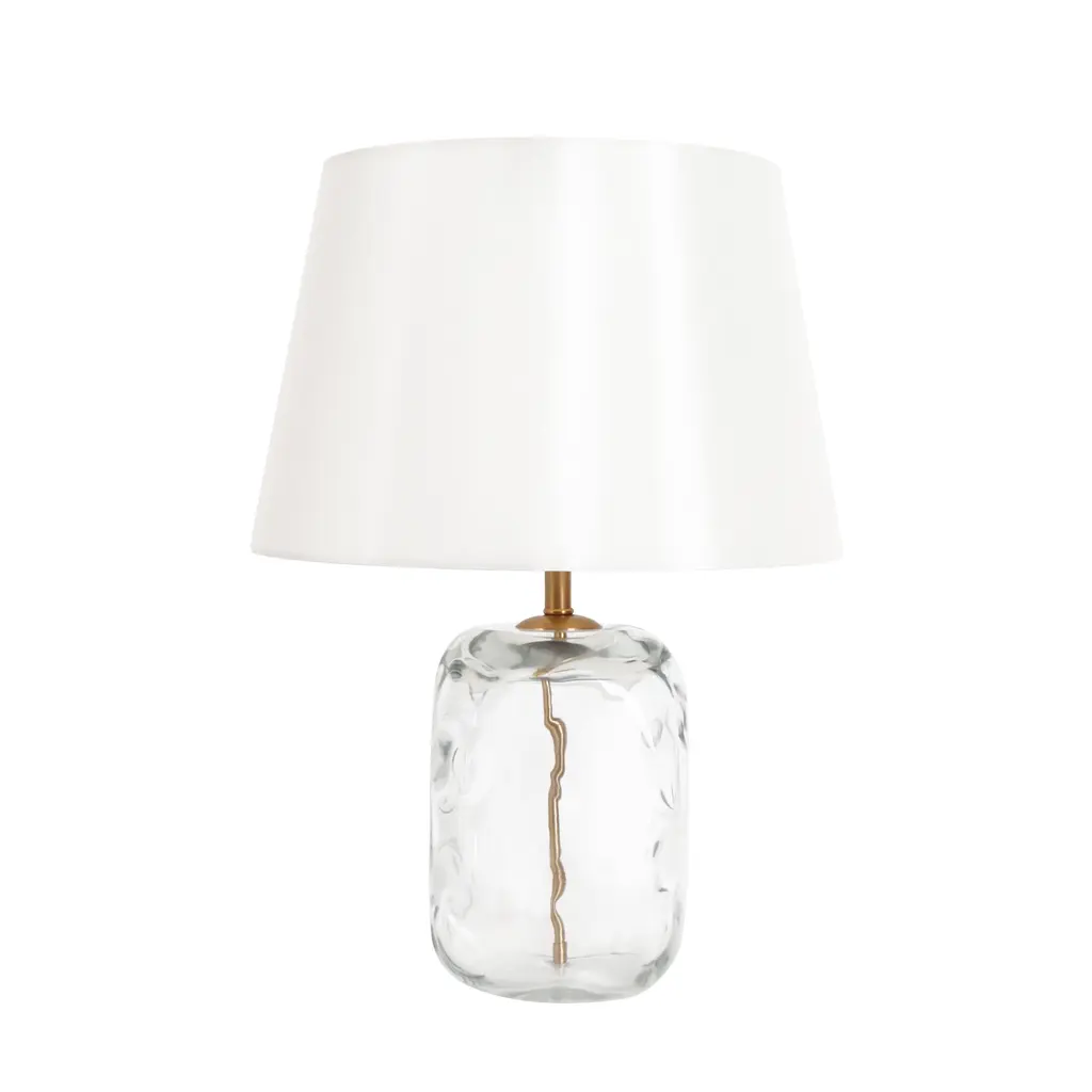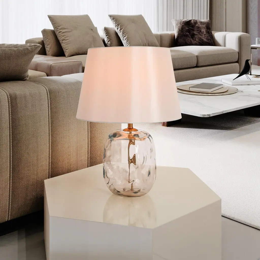 This table lamp features a wavy crystal glass base and electroplated gold brass finish metal rod to bring a modern and stylish atmosphere to your home, the minimal design maximizes lighting while reflecting its glow, the thick, wavy glass encloses a center tube in a brass finish that conceals the cord. Topped with a beige mercerized shade, this simple aesthetics table lamp is an elegant choice for a console, dresser, or side table.Features:Wipe metal with a soft, dry cloth; avoid the use of harsh chemicals or abrasive cleaning materialsSpecifications:
