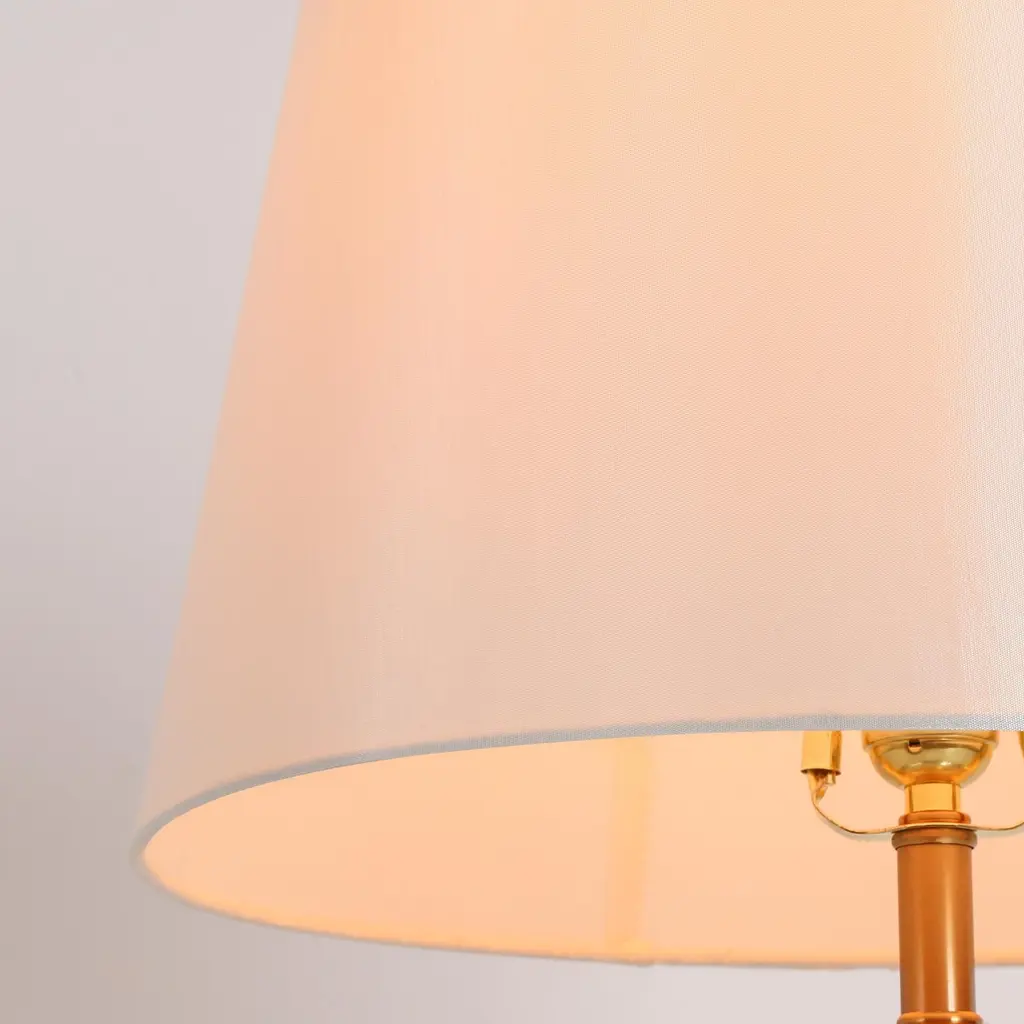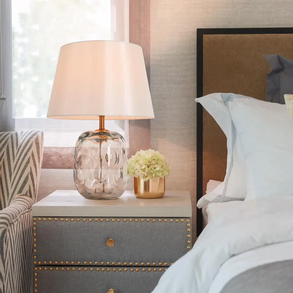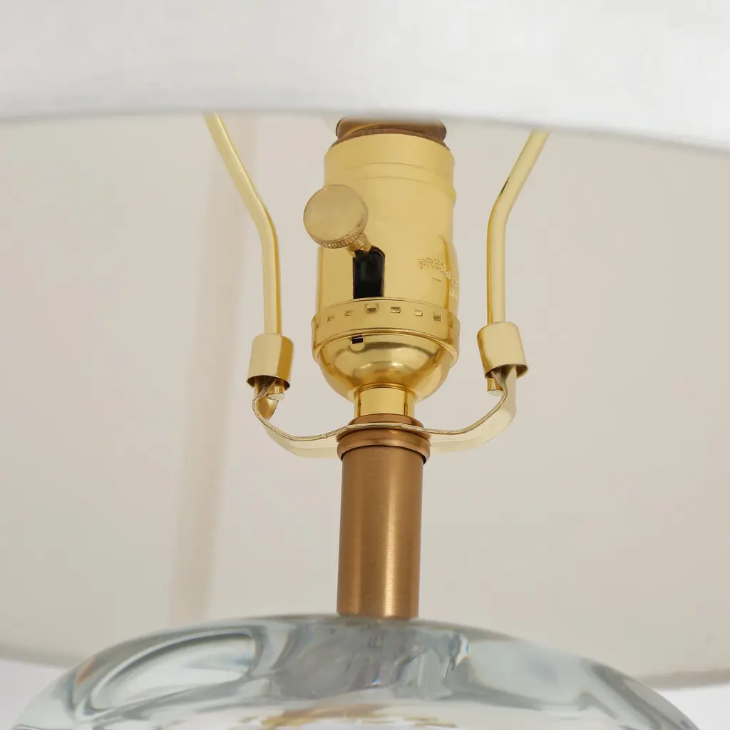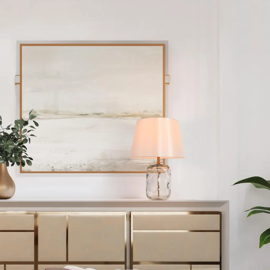 This table lamp features a wavy crystal glass base and electroplated gold brass finish metal rod to bring a modern and stylish atmosphere to your home, the minimal design maximizes lighting while reflecting its glow, the thick, wavy glass encloses a center tube in a brass finish that conceals the cord. Topped with a beige mercerized shade, this simple aesthetics table lamp is an elegant choice for a console, dresser, or side table.Features:Wipe metal with a soft, dry cloth; avoid the use of harsh chemicals or abrasive cleaning materialsSpecifications: