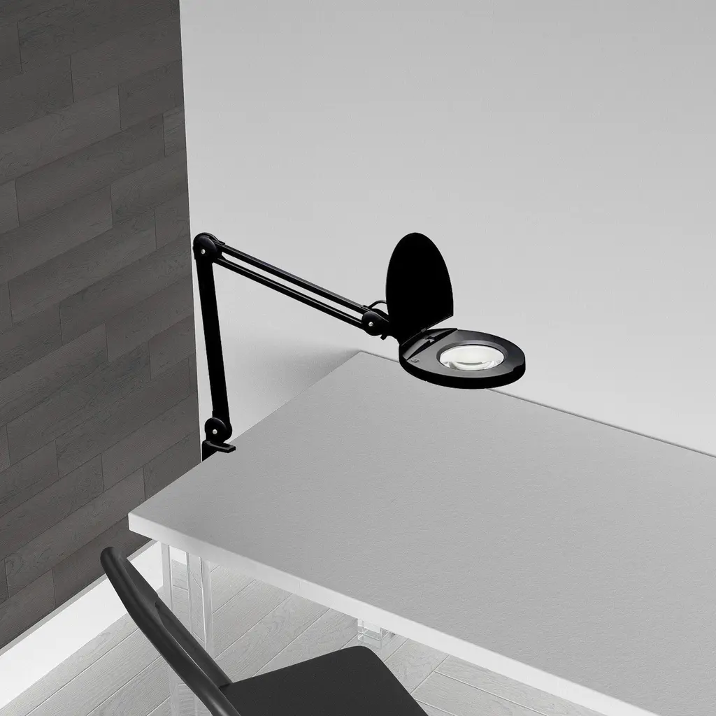 The design of the Magnifier Lamp family is both highly practical and intriguing to the eye. The design features an integrated LED light. LED fixtures produce light at up to 90 percent better efficiency than incandescent lighting. The metal frame is installed on a table, desk or shelf, with an articulated arm that can be adjusted to the desired angle. A dimmable LED and magnifying function make it the perfect addition to your favorite reading or work corner. With its elegant design, it adds a note of functional luxury to your bedroom or office space, or wherever stylish directional light is needed.