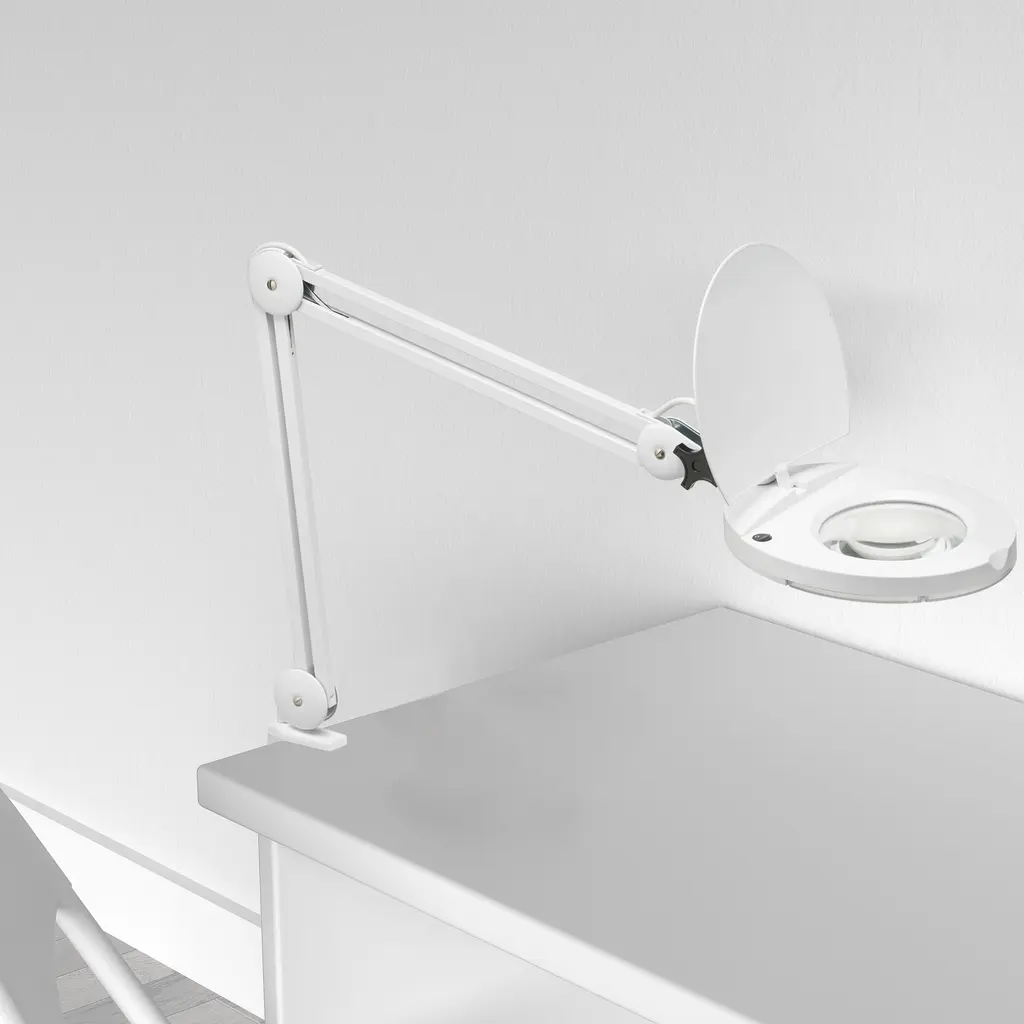 The design of the Magnifier Lamp family is both highly practical and intriguing to the eye. The design features an integrated LED light. LED fixtures produce light at up to 90 percent better efficiency than incandescent lighting. The metal frame is installed on a table, desk or shelf, with an articulated arm that can be adjusted to the desired angle. A dimmable LED and magnifying function make it the perfect addition to your favorite reading or work corner. With its elegant design, it adds a note of functional luxury to your bedroom or office space, or wherever stylish directional light is needed.
