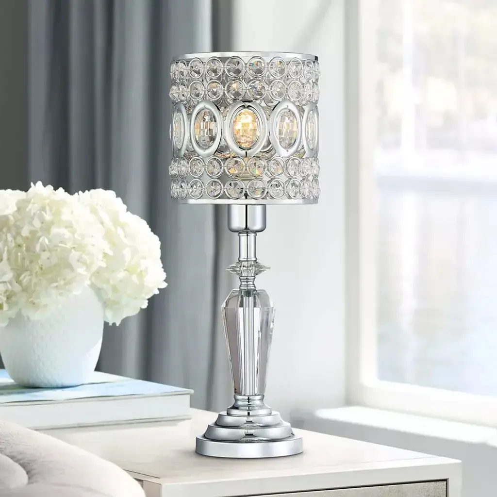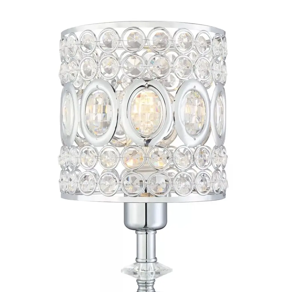PRODUCT DETAILS: 17" high overall. Base only is 4 3/4" wide. Shade is 6 1/2" wide x 6 1/2" high. Weighs 3.6 lbs. Uses one maximum 60 watt standard-medium base bulb (not included), In-line on-off cord switch. Crystal accent table lamp. Crystal lamp body. Crystal glass construction. Chrome finish metal base and accents. Shade is crafted from crystal with a metal frame. 8-foot long cord. Cord switch is 16" from the base.