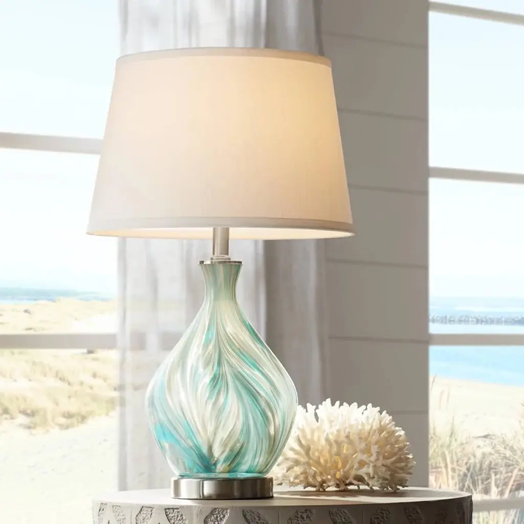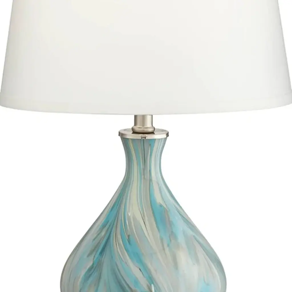 PRODUCT DETAILS: 22" high. Shade is 11" wide at the top x 13 1/2" wide at the bottom x 9" high. Weighs 5.9 lbs. Uses one maximum 100 watt E26 standard-medium base bulb (not included). On-off socket switch. Cirrus art glass vase table lamp. Blue and gray glazed glass finish. Metal base and accents. Please note - slight variations in color and pattern may occur. White tapered drum shade. Comes with 8-feet of cord.