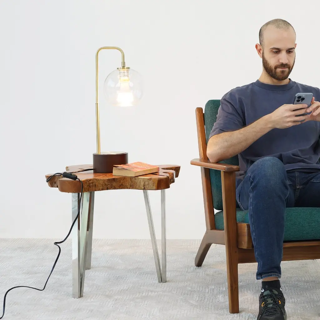 Elevate your space with this mid-century modern-inspired table lamp, featuring a walnut-finished solid rubber wood base, a sleek bronze arched stem, and a clear glass globe for understated elegance. Designed to deliver balanced, ambient lighting, it effortlessly enhances any room with a warm, inviting glow.Features:Perfect For:• Bedside lighting • Reading nooks • Living room accents • Office task lighting • Entryway decorProduct Details:Package Includes:Note: