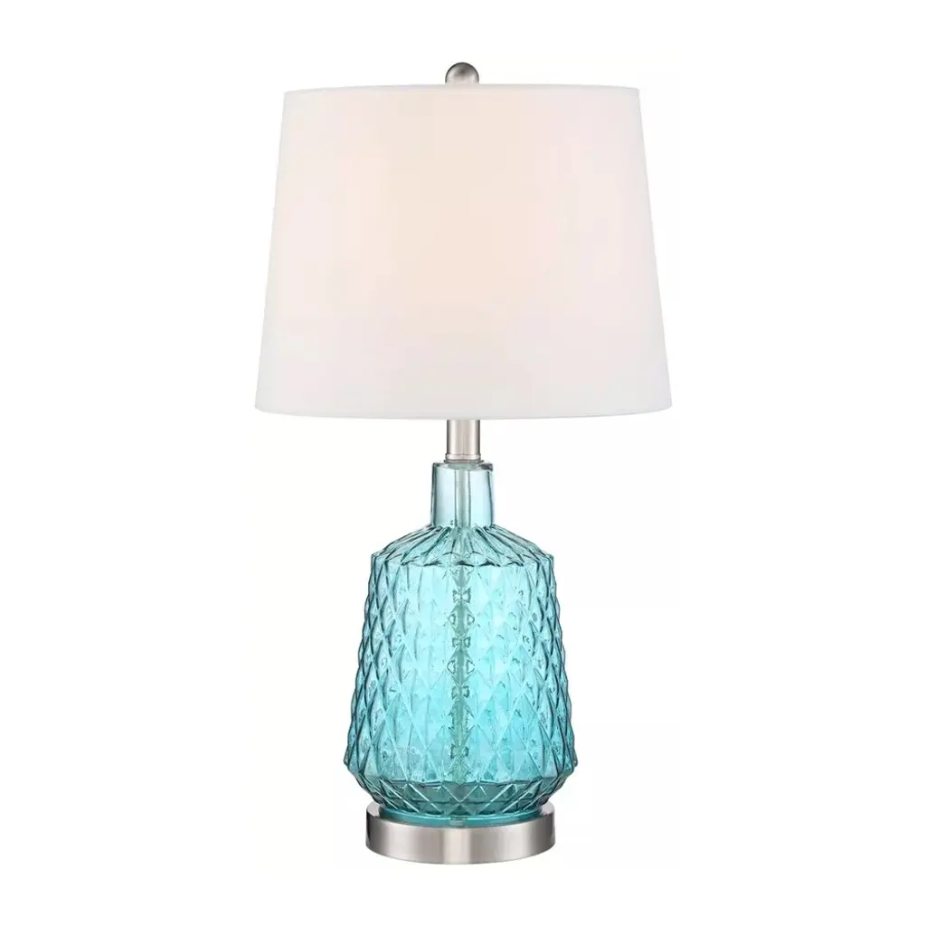PRODUCT DETAILS: 22" high overall. Base is 5 1/2" wide. Shade is 10" across the top x 12" across the bottom x 9" high. Weighs 3.96 lbs. Uses one maximum 100 watt standard-medium base light bulb (not included). On-off switch socket. A bright and colorful look ideal for coastal modern decor. Blue glass lamp body with a textured pattern. Glass construction. Brushed nickel finish metal accents. White fabric tapered drum shade. 8-foot long clear cord.