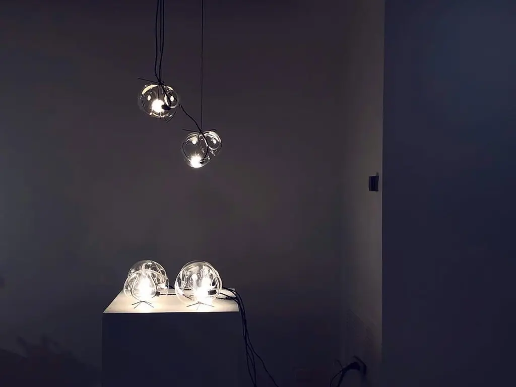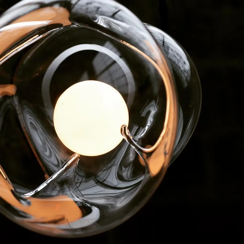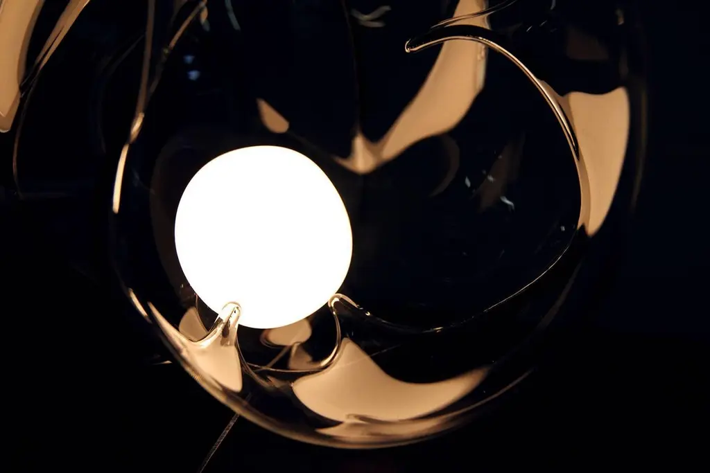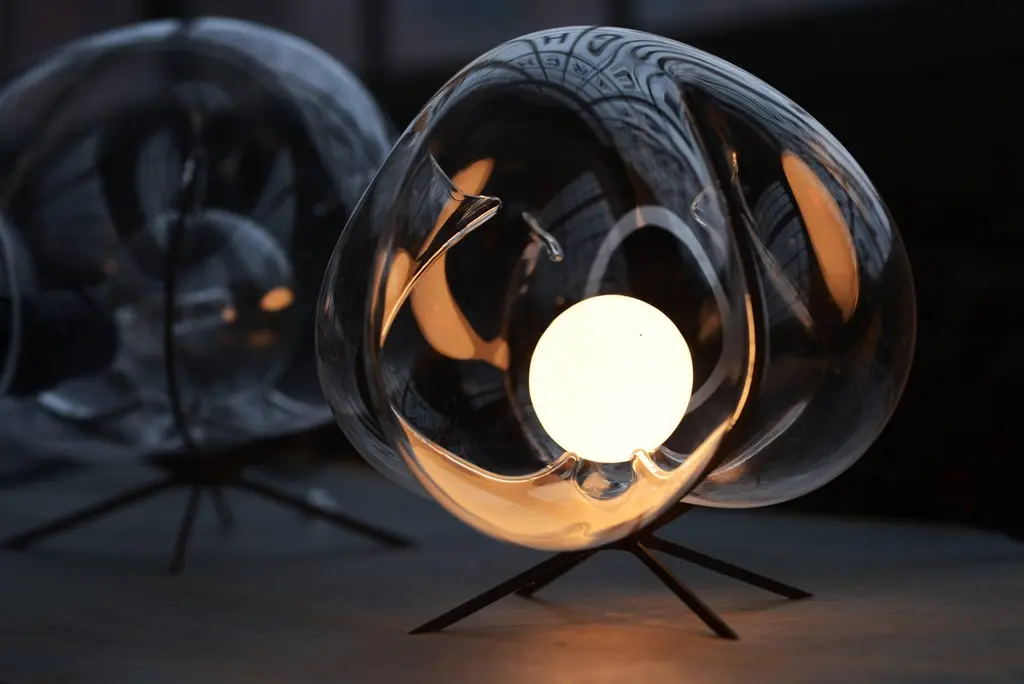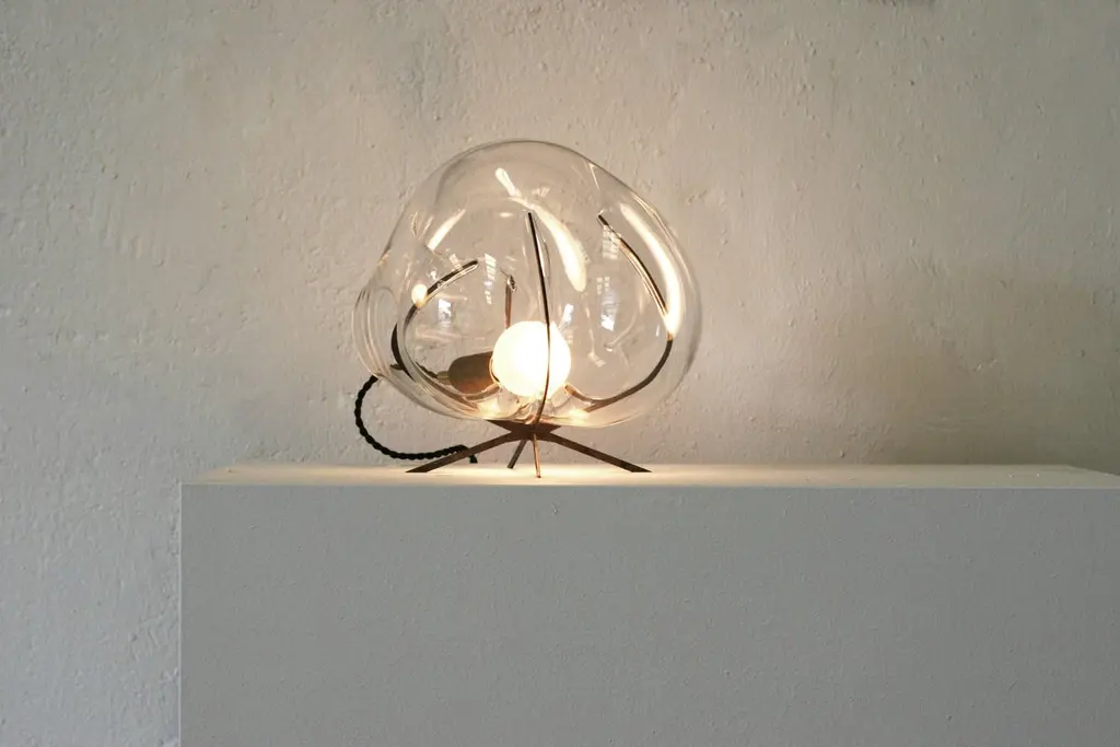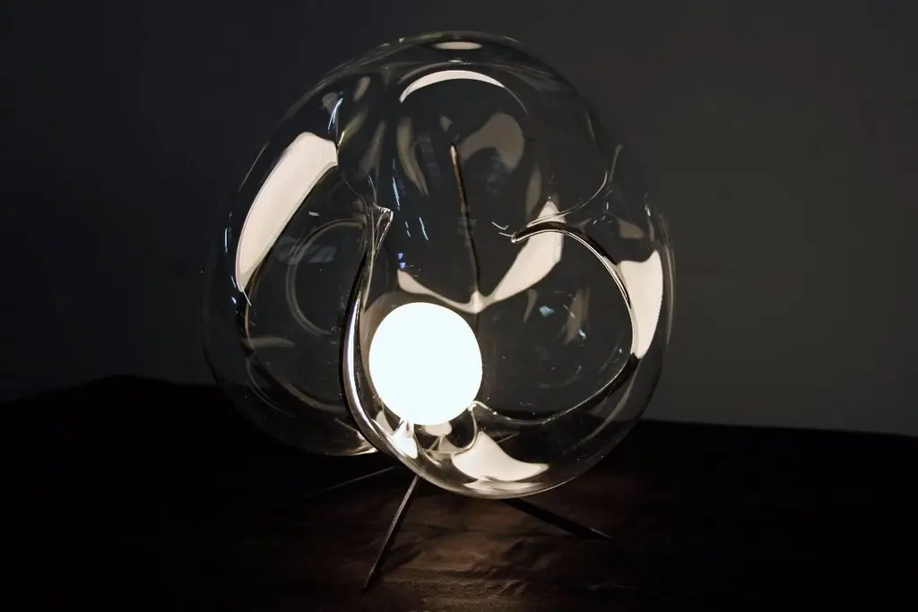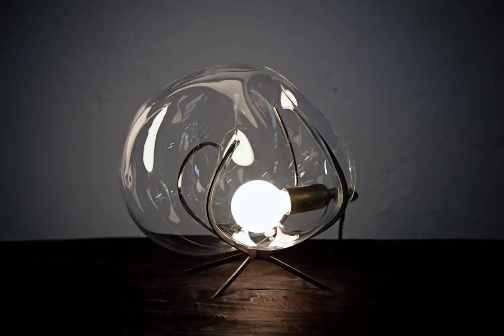 Modern Crystal Glass & Steel Standing Light Table Lamp 'Exhale' by Catie NewellMeasures: Diameters 30 cm x Height 20 cmMaterials: Crystal glass, Stainless steel.Customization is available. Please contact us!Exhale skillfully encases a single blow of glass within a rigid metal structure. The metal form restricts the glass by pinching, hooking and spiking into the volume during the blowing process, capturing a tense play between the constricting and billowing materials. The entire fixture catches one breath.Catie Newell is known for taking unexpected turns, in her career and in her work. From flight and engineering, Newell crossed into architecture and design. She seeks to make the familiar unfamiliar, and the material process of fabrication is a vital act in her work. Her installations have unpredictable effects on their surroundings, inter vening to highlight what is often left unseen. Exhale, undertaken in partnership with Wes McGee and blower Brian Barber, creates deep physical resonance between strength, fragility, and the fleeting breath that brings them together.