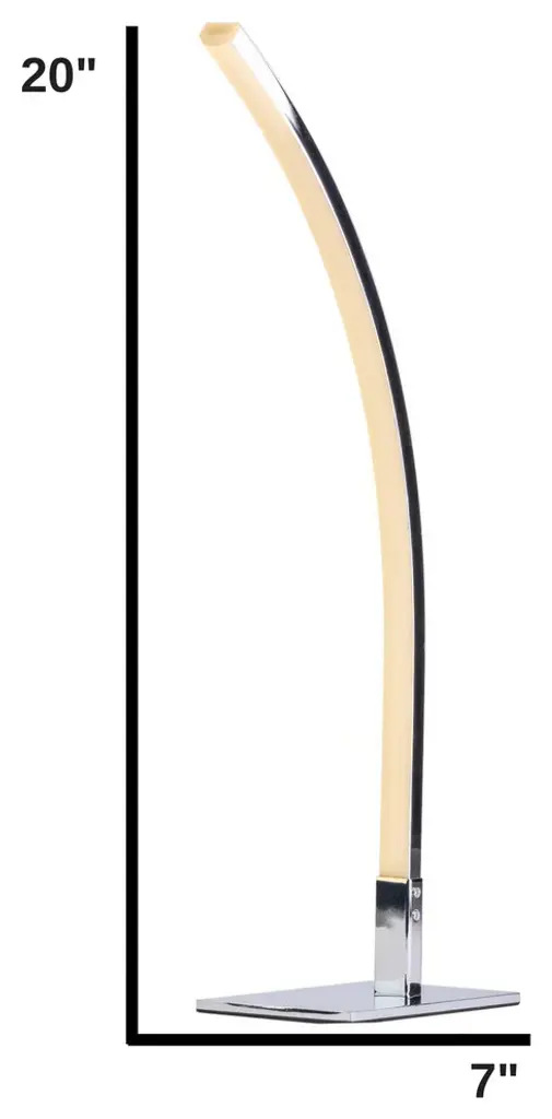 This Modern Arc table lamp can be the perfect addition to your lighting needs in your home or office space. The lamp is a neutral white light of 4000 kelvins and 540 lumens. This modern Arc table lamp is chrome and has an integrated LED strip of 6 watts. The LED strip will last you over 30,000 hours of use, and that is equivalent to 5 to 7 years of constant usage. This table lamp will bring an artistic and modern style to your space, even when not turned on in use. This Modern Arc Design LED lamp is great for a corner, living room, bedroom, office, any tight spaces, even as a studio lamp. This lamp features an aluminum and acrylic base with the integrated LED strip covered with a silicone cover. Finesse Decor brings you the greatest looks in modern and contemporary lighting so that you can step up your interior decorating skills to the next level. SPECS:LED strip6 wattsLight Temperature: 4000K540 LumensWeight: 4 LbsHeight: 20 inches