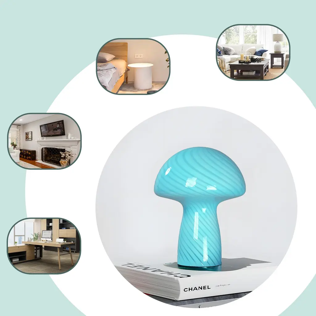 This mushroom shaped table lamp is made of handcrafted glass material, featuring a cute and delicate design with a smooth and refined texture, perfectly combining simplicity and elegance to add a touch of color in your room. The compact and exquisite lamp shows the beauty of translucent light and shadow interaction, making it even more dazzling. The unique combination of mushroom shape and diverse colors not only offers visual enjoyment, but also practical functionality.Feature:Highlight: