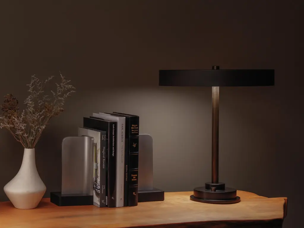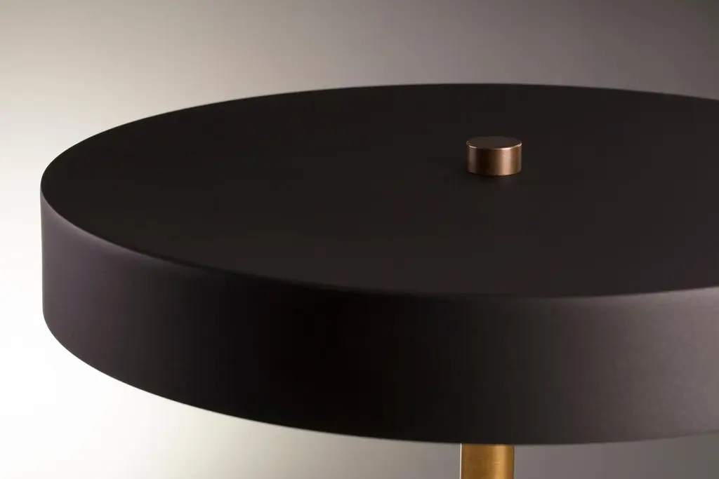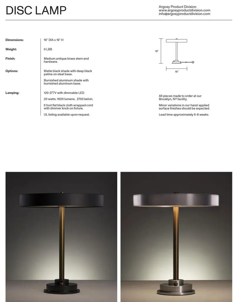 Collection I: Disc lamp in matte blackAvailable in a matte black or softly burnished finish, the shade of the disc lamp can either fade into its surroundings or catch light to emphasize its refined form.The integrated dimmable LED module creates both soft mood and ample task light options.Made to order.