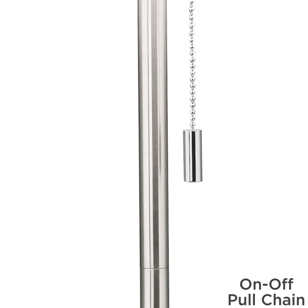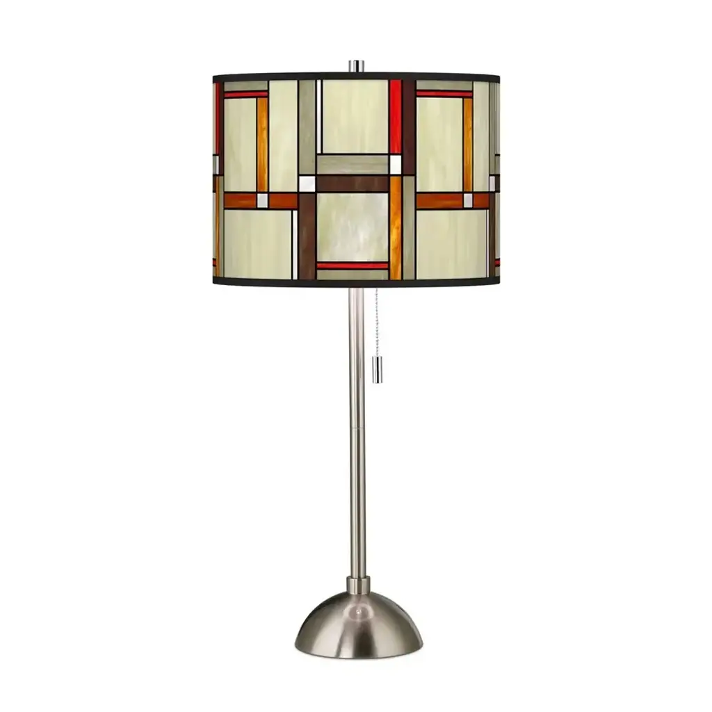 PRODUCT DETAILS: 28" high overall. Shade is 10" high x 13 1/2" wide. Weighs 5.2 lbs. Uses one maximum 100 watt bulb (not included). On-off pull chain switch. Modern stick lamp with a custom-made Modern Squares pattern giclee printed shade. Translucent drum shade design. Note that the shade has a printed pattern on canvas and does not use real glass. Brushed nickel finish pull chain table lamp. 8-foot long cord.
