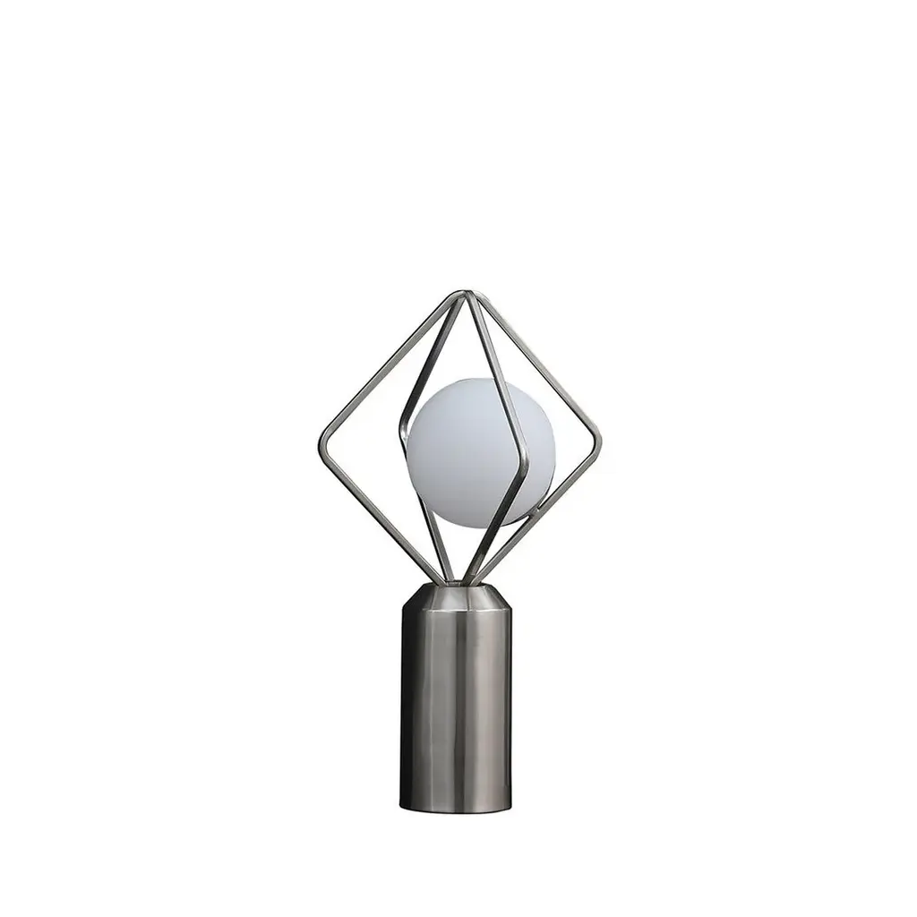 Introducing our modern and elegant Glass Orb Table Lamp with dimensions of 12.00"L x 12.00"W x 19.50"H and a weight of 7.30 lbs. Crafted with a white glass orb shade and a brushed silver metal table body, this lamp combines sophistication with contemporary design. The glass orb shade (6.25"L x 6.25"W x 6.25"H) provides soft and ambient lighting, while the octahedron brushed silver metal cage (12"L x 12"W x 12"H) adds a unique touch. The brushed silver cylindrical table body (4.5"L x 4.5"W x 8.5"H) complements the overall aesthetic. Equipped with a 40 Watt G9 3.2W LED bulb, this lamp features an in-line on/off switch on the silver cord for easy operation. UL-listed for safety and imported for quality assurance, this lamp is easy to clean with a damp cloth.Features:Specifications: