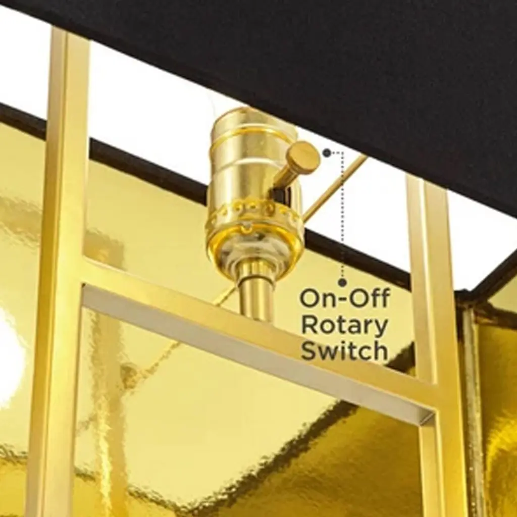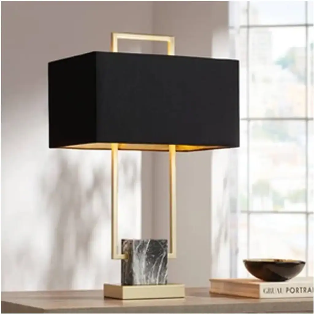 PRODUCT DETAILS: 24 3/4" high. Base is 6 1/2" wide x 3 3/4" deep. Shade is 15" wide x 10" deep x 8" high. Weighs 4.8 lbs. Uses one maximum 100 watt standard-medium base bulb. On-off socket switch. A modern look for living rooms and sitting areas. Gold finish open base design. Metal construction. Gray faux marble accent. Black fabric rectangular shade. 8-foot long clear cord.