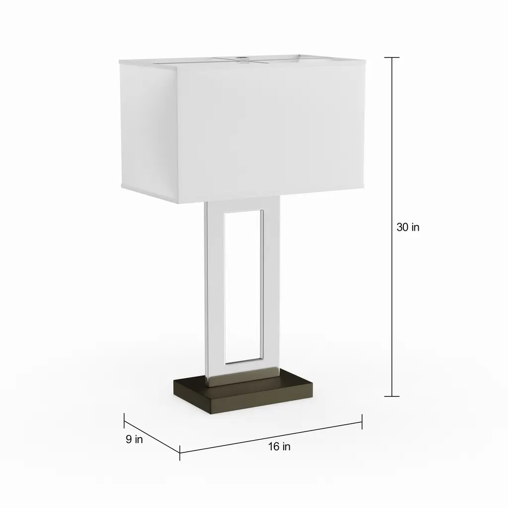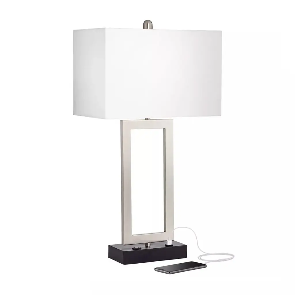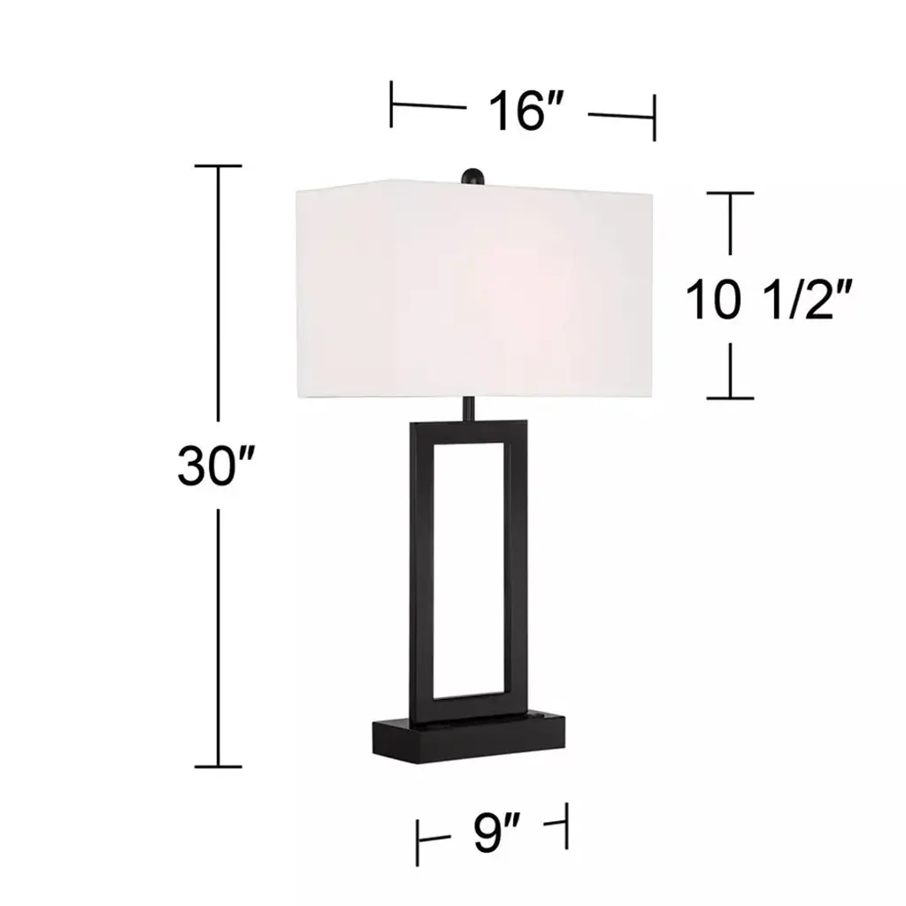 PRODUCT DETAILS: 30" high overall. Bottom base is 9" wide x 4 1/2" deep. Rectangular shade is 16" wide x 9" deep x 10 1/2" high. Weighs 3.1 lbs. Uses one maximum 100 watt standard-medium base bulb (not included). On-off socket switch. Contemporary modern USB table lamp from 360 Lighting. Built-in 2 amp USB port and an electrical outlet on the base. Brushed nickel finish over metal construction. Black finish metal pedestal base. Rectangular white fabric shade. 8-foot long cord.