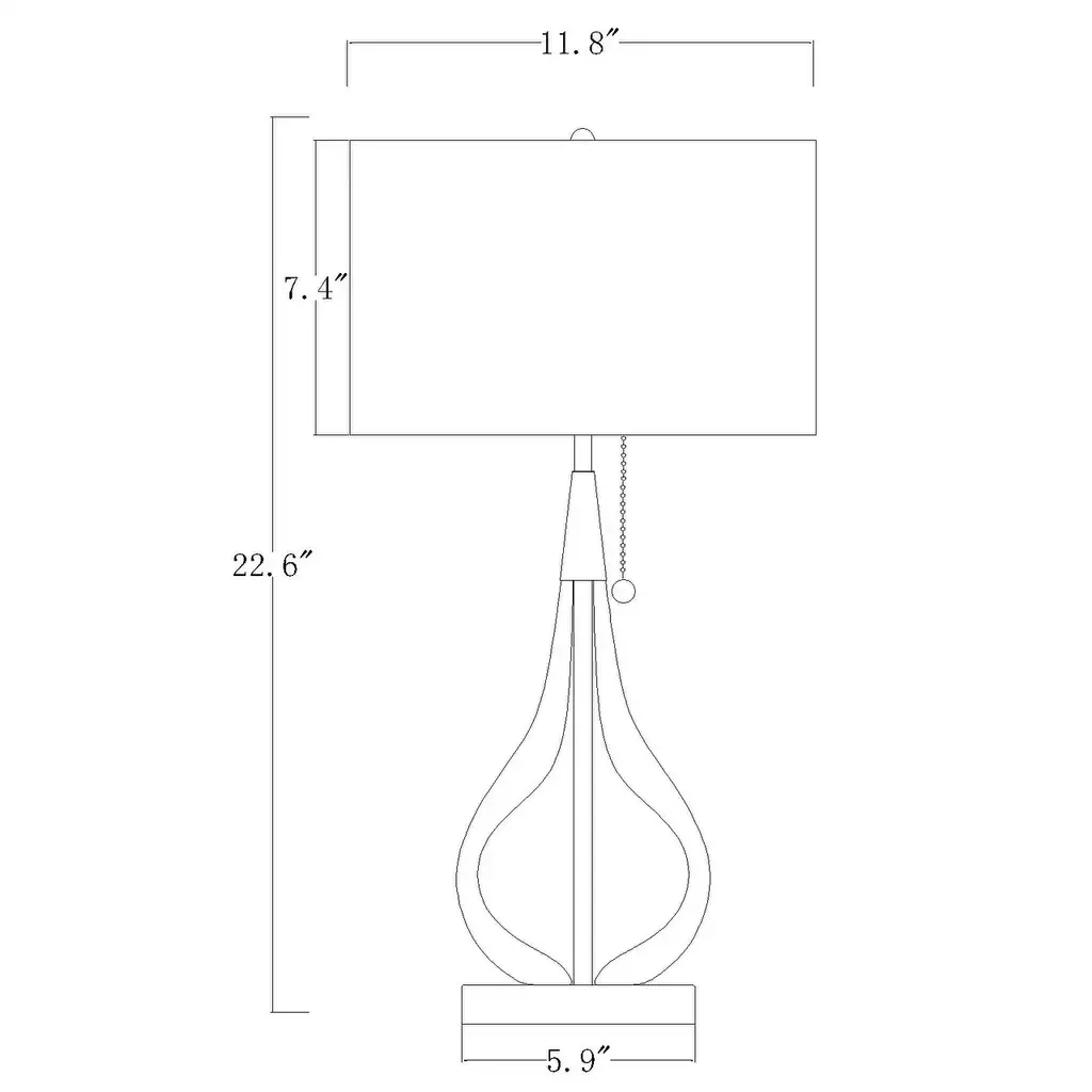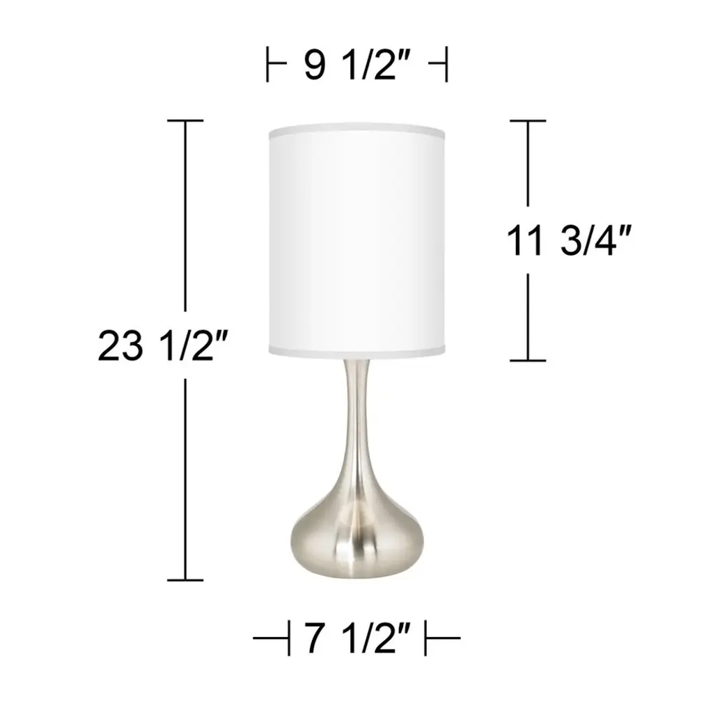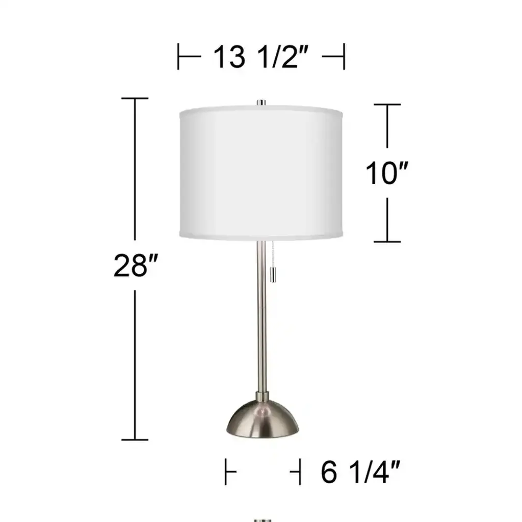 PRODUCT DETAILS: 30" high overall. Bottom base is 9" wide x 4 1/2" deep. Rectangular shade is 16" wide x 9" deep x 10 1/2" high. Weighs 3.1 lbs. Uses one maximum 100 watt standard-medium base bulb (not included). On-off socket switch. Contemporary modern USB table lamp from 360 Lighting. Built-in 2 amp USB port and an electrical outlet on the base. Brushed nickel finish over metal construction. Black finish metal pedestal base. Rectangular white fabric shade. 8-foot long cord.