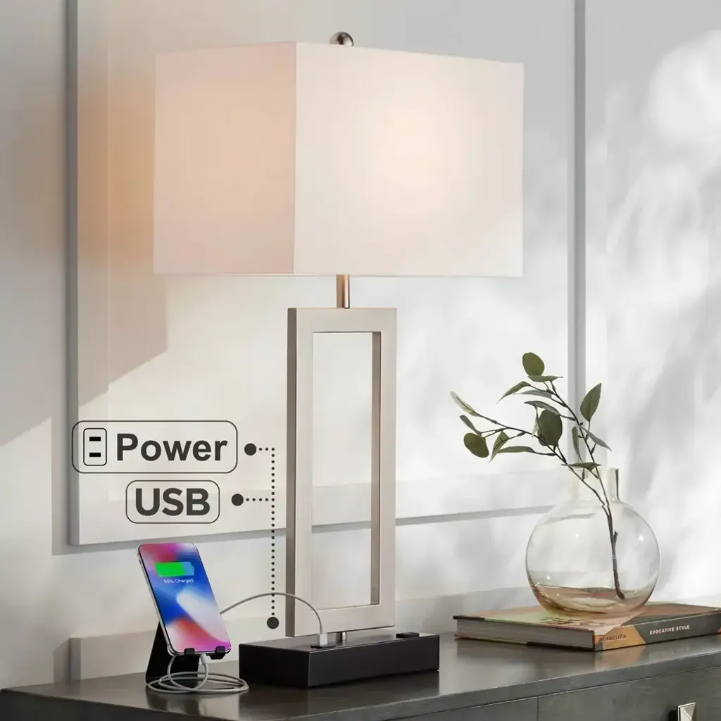 Modern Table Lamp 30" Tall Brushed Nickel With Usb And Outlet - 16" X 30" - 16" X 30" - Silver
