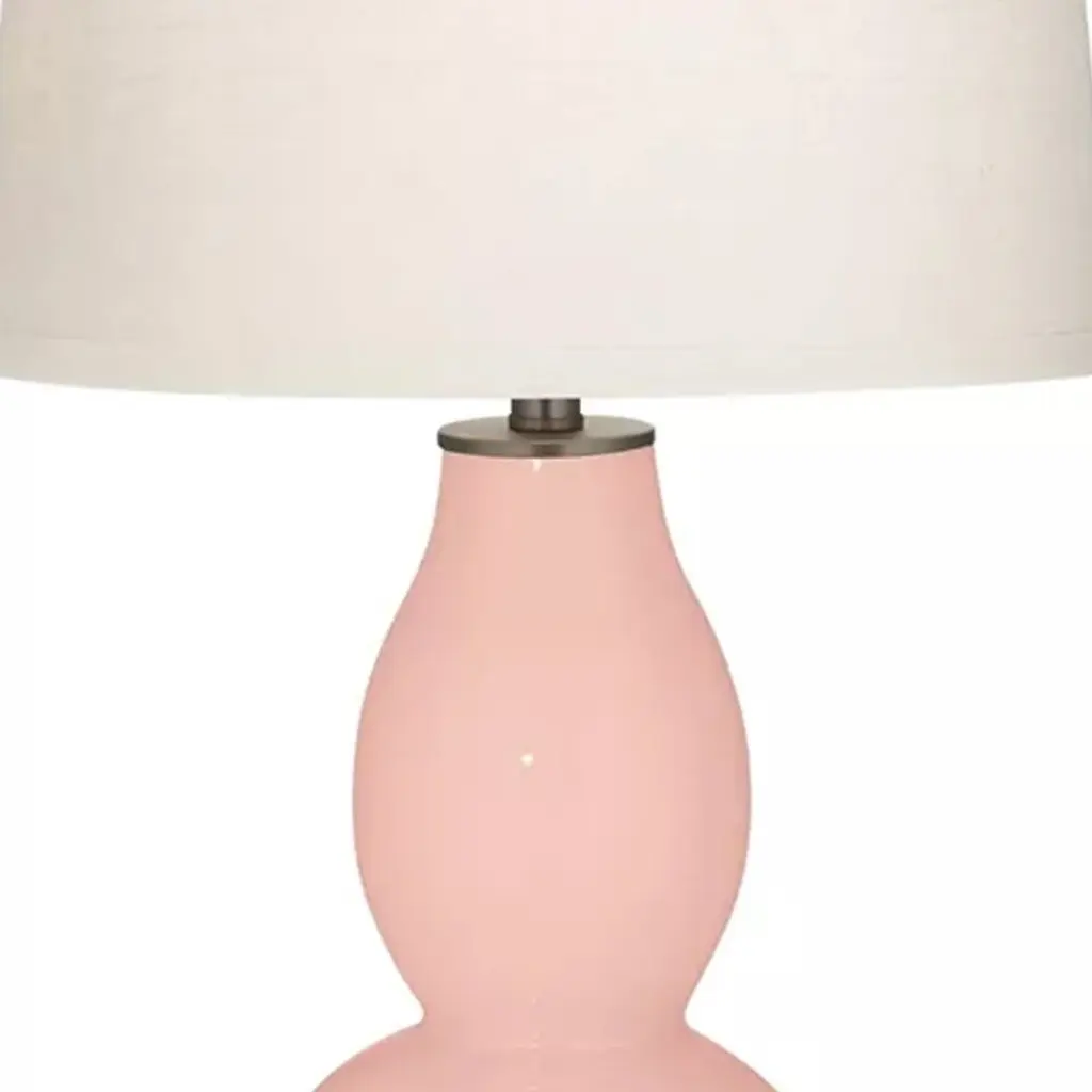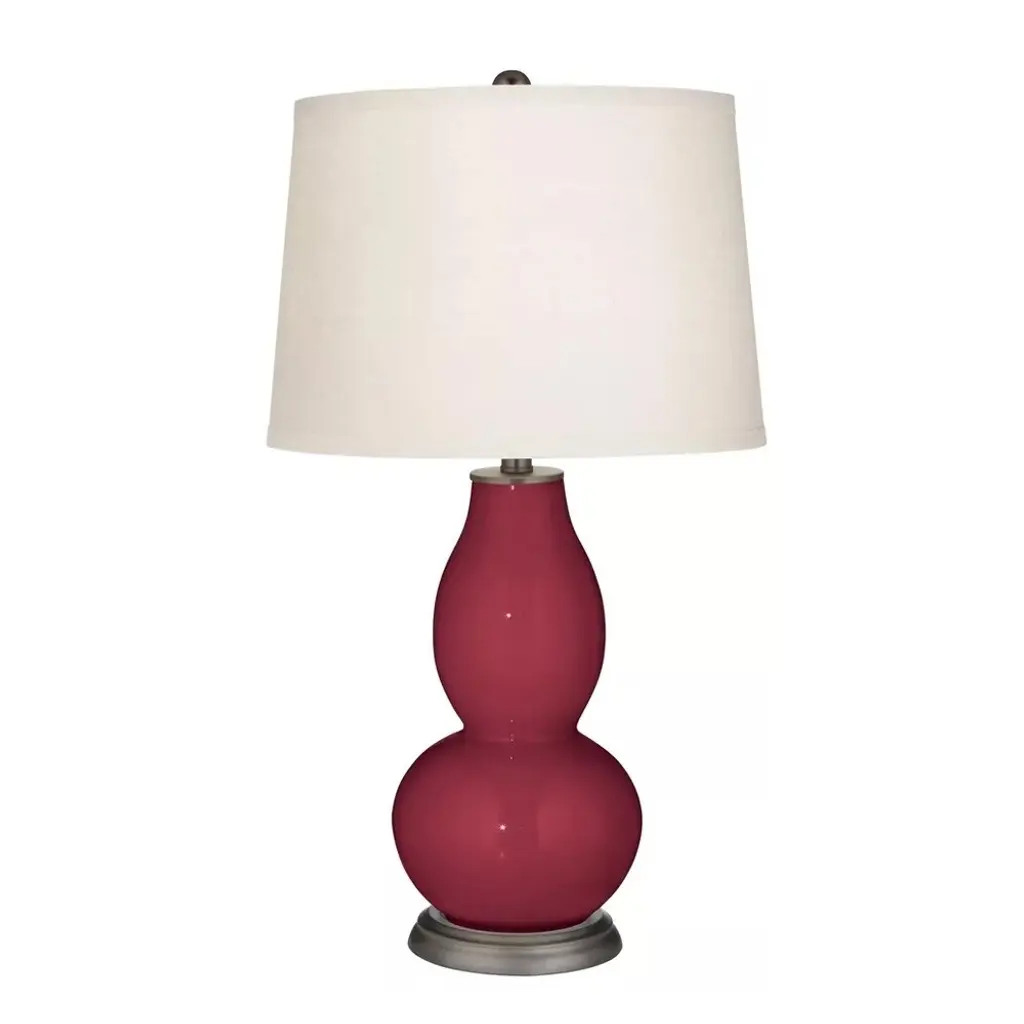 PRODUCT DETAILS: 28 3/4" high overall. Shade is 14" across the top x 16" across the bottom x 11" high. Uses one maximum 150 watt standard-medium base bulb (not included). On-off socket switch. Hand-crafted double gourd glass table lamp Designer Antique Red lamp base color. High-quality plated bronze base and finial finish. Off-white color designer lamp shade. 8-foot long cord. DESCRIPTION: This double gourd glass table lamp offers a brilliant color accent for your home decor. The designer Antique Red base is hand-crafted by our experienced artisans in California, and is topped by a clean off-white drum shade.