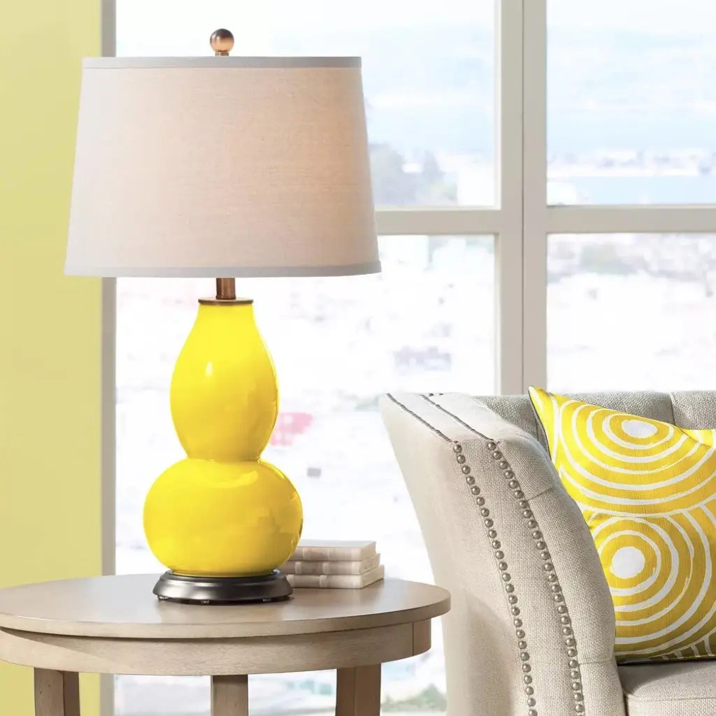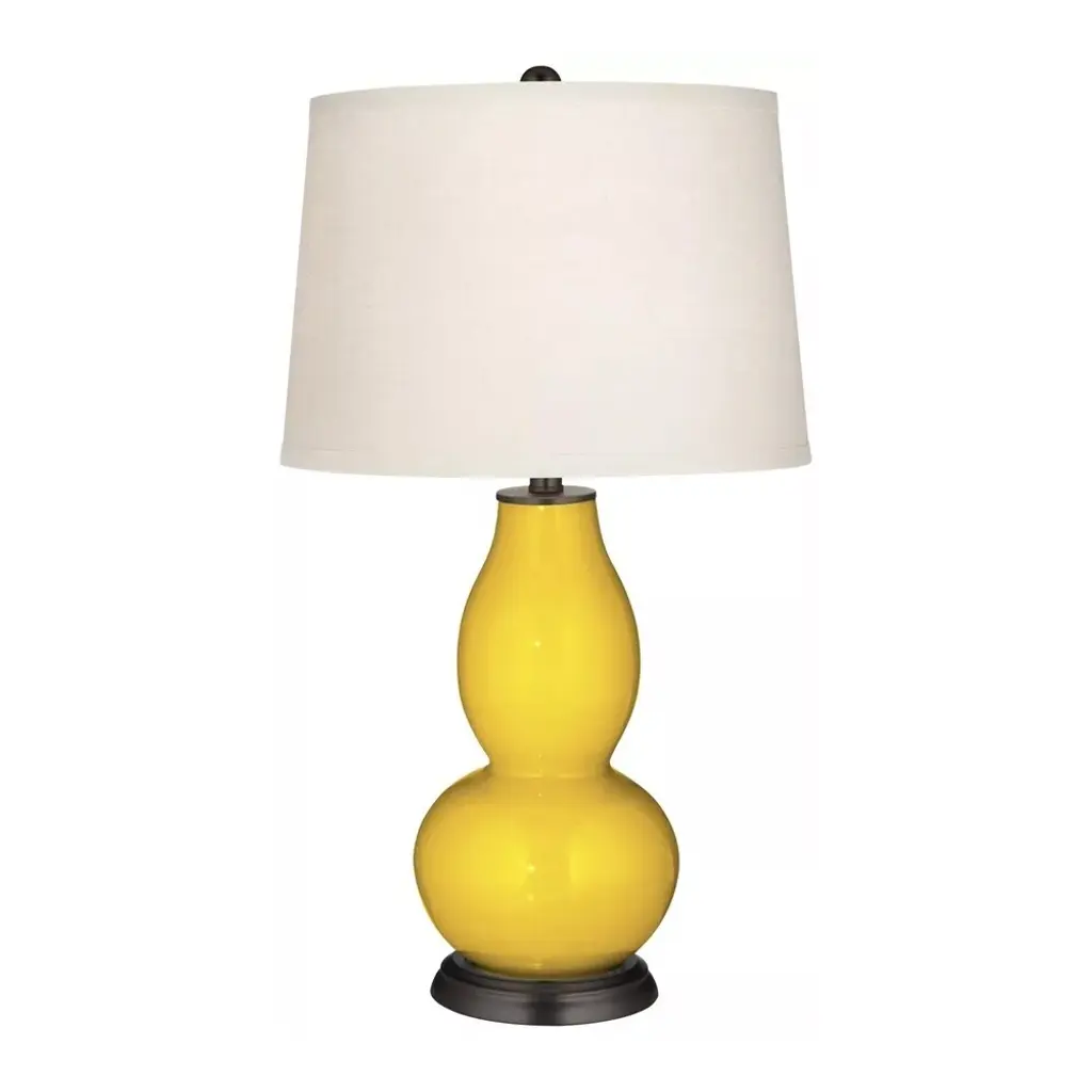 PRODUCT DETAILS: 28 3/4" high overall. Shade is 14" across the top x 16" across the bottom x 11" high. Uses one maximum 150 watt standard-medium base bulb (not included). On-off socket switch. Double gourd glass table lamp PRODUCT DETAILS: 28 3/4" high overall. Shade is 14" across the top x 16" across the bottom x 11" high. Uses one maximum 150 watt standard-medium base bulb (not included). On-off socket switch. Double gourd glass table lamp This double gourd glass table lamp offers a brilliant color accent for your home decor. The sunny designer Citrus Yellow lamp base has an eye-catching double gourd profile, and is topped by an off-white drum shade. A bronze finish metal accent is at the very bottom of the design. Lamp base U.S. Patent # 8,899,798. A great way to add designer color and style to your home.
