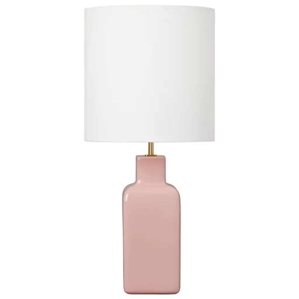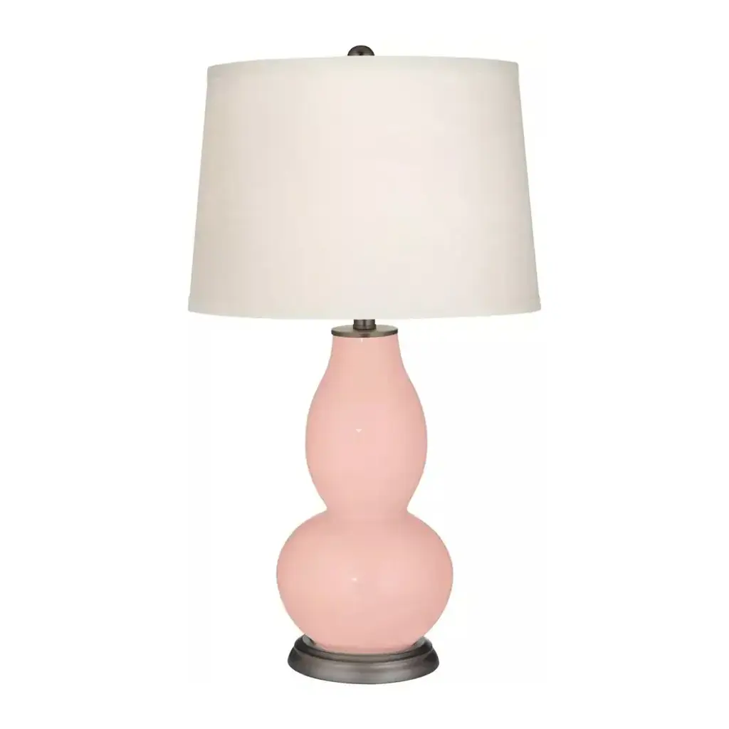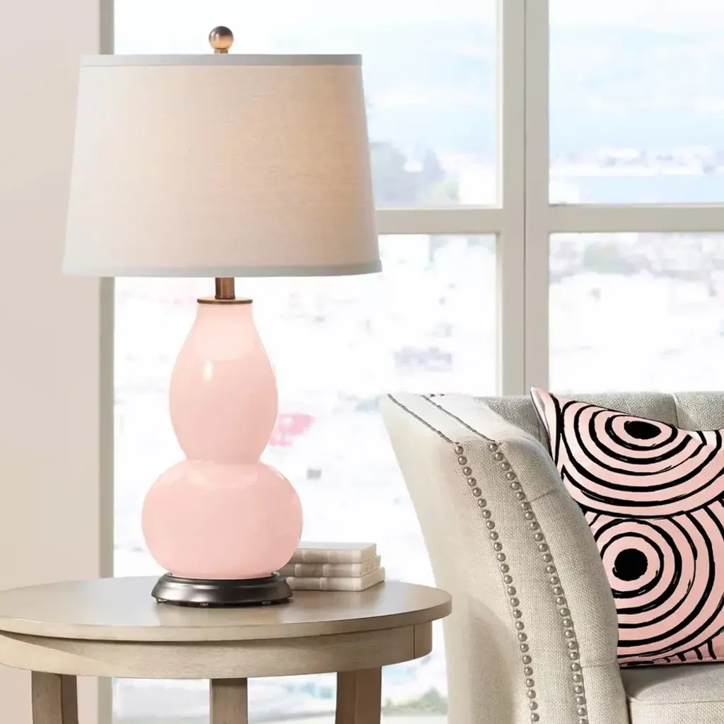 PRODUCT DETAILS: 28 3/4" high overall. Shade is 14" across the top x 16" across the bottom x 11" high. Uses one maximum 150 watt standard-medium base bulb (not included). On-off socket switch. Hand-crafted double gourd glass table lamp Designer Rose Pink lamp base color. Off-white designer shade. High-quality plated bronze base and finial finish. 8-foot long cord. DESCRIPTION: This double gourd glass table lamp offers a brilliant color accent for your home decor. The designer Rose Pink base is hand-crafted by our experienced artisans in California, and is topped by a clean off-white drum shade.
