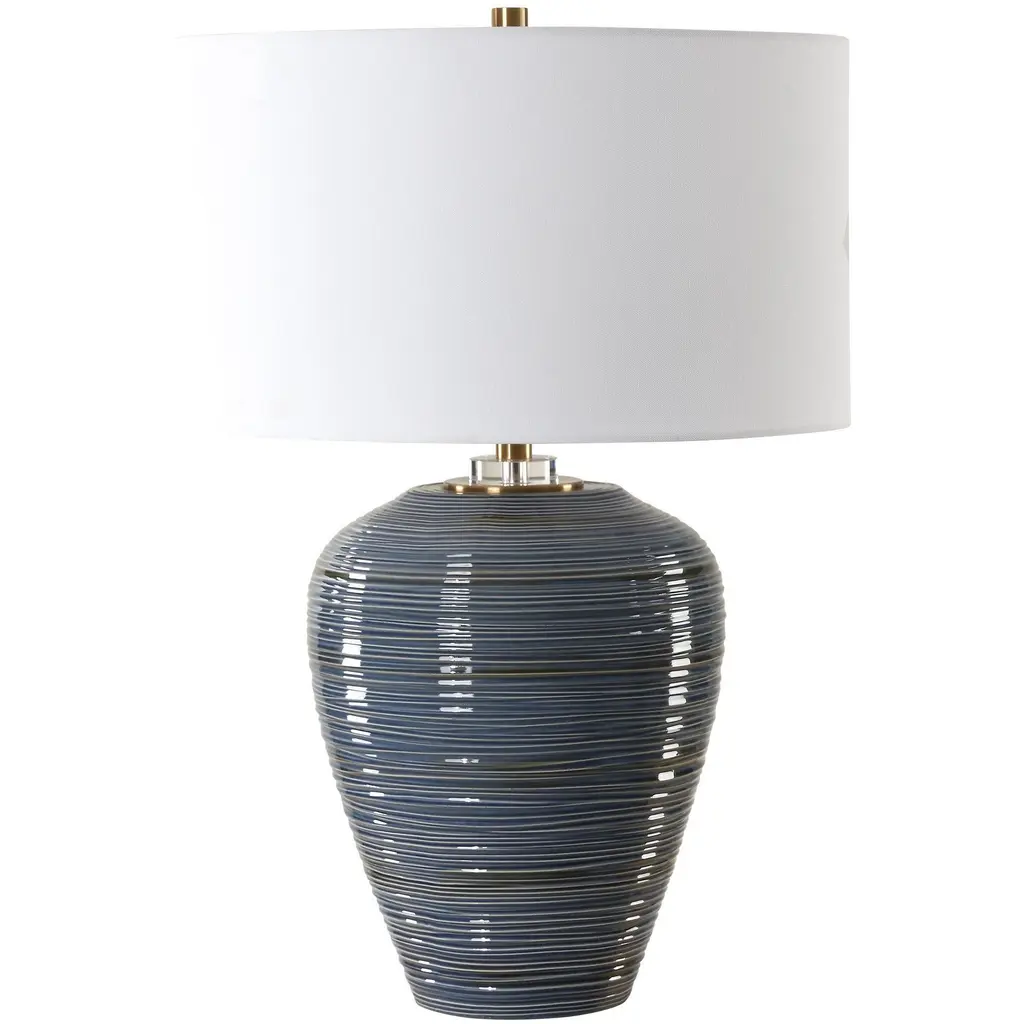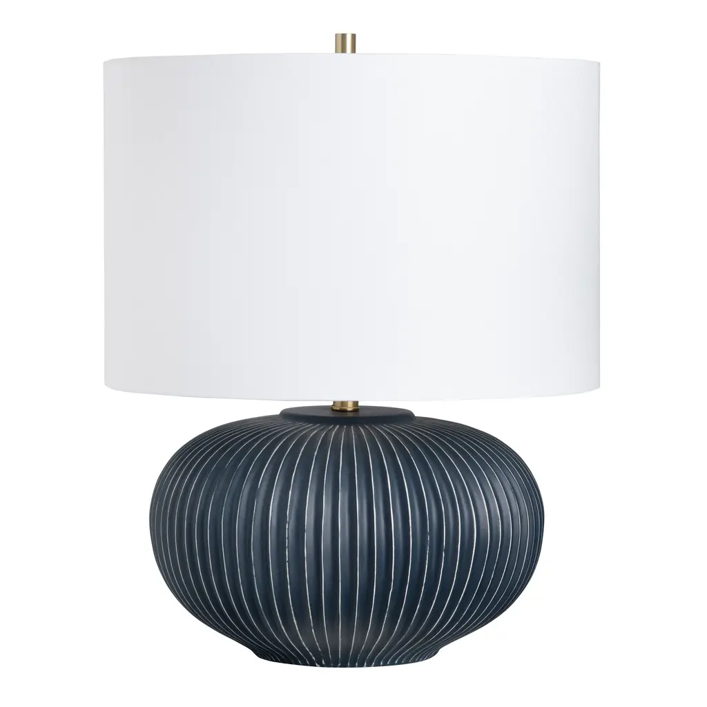 Illuminate Your Space With This Stunning Table Lamp, Featuring An Organically Ribbed Texture, Finished In A Glossy Blue Glaze With Darker Blue Details, Complemented By Plated Brass Accents. Enhance Any Decor With Its Timeless Elegance And Warm Ambiance. The Round Hardback Drum Shade Is Covered In A Crisp White Linen Fabric. Due To The Nature Of Fired Glazes On Ceramic Lamps, Finishes Will Vary Slightly.