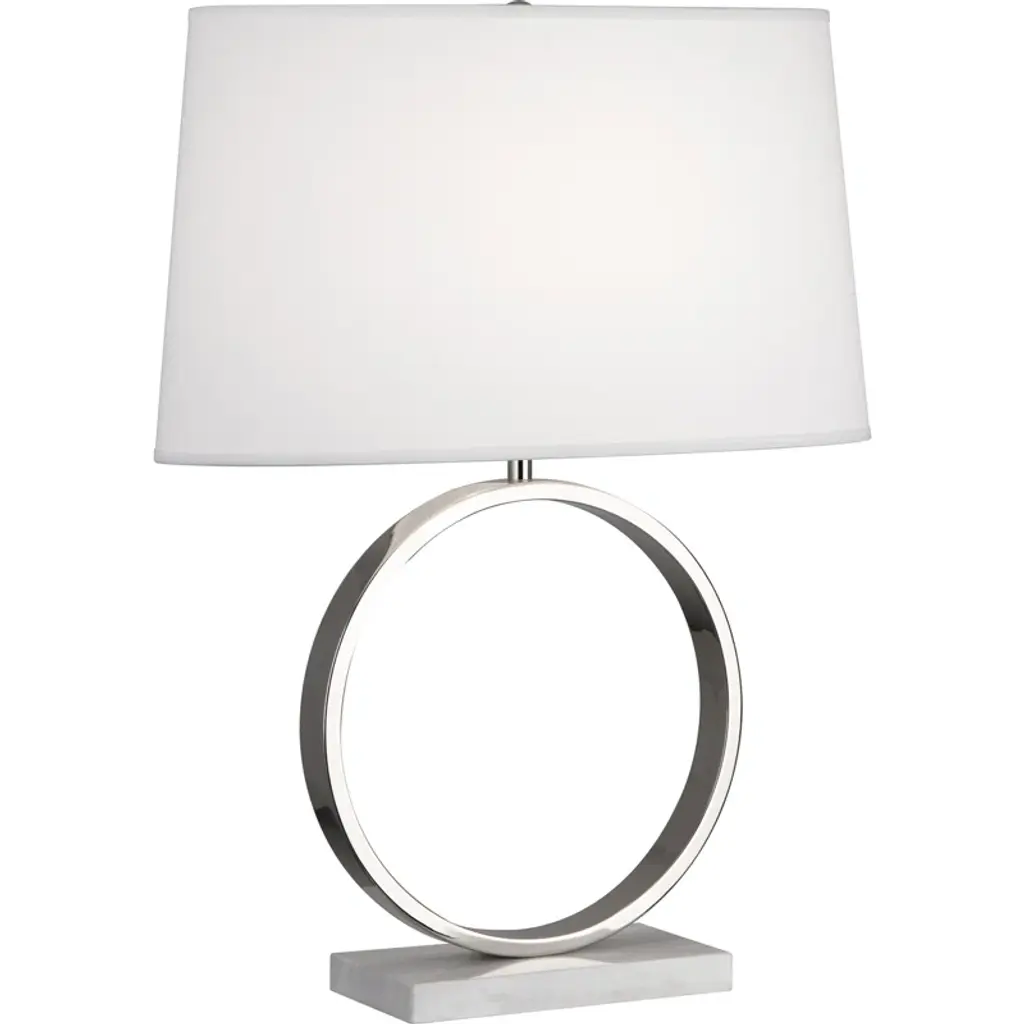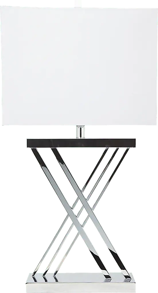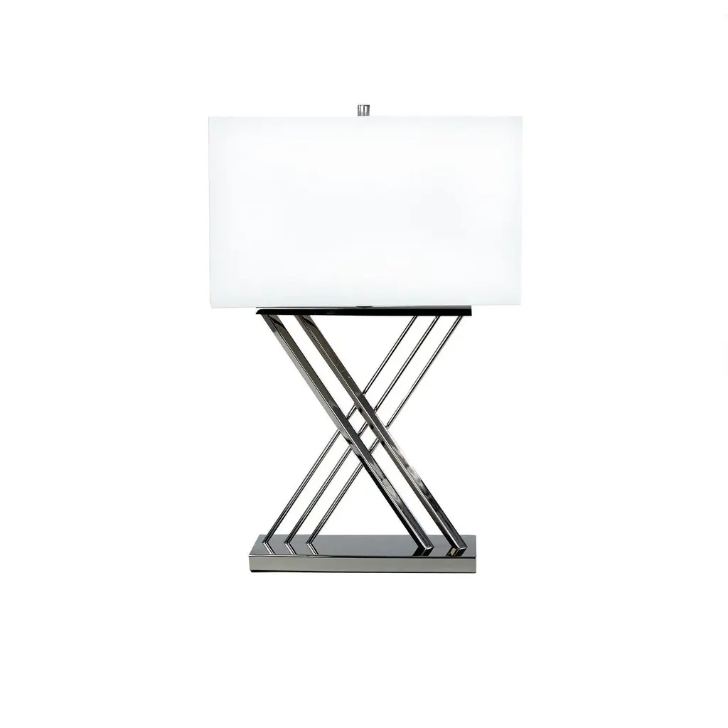 The Moira Table Lamp showcases a stunning combination of clean, straight lines and curvaceous flourishes. A body of Polished Stainless Steel is framed within a rectangular shape, displaying several slender arches that imbues the piece with stunning depth. The two-tiered rectangular base features a transparent acrylic layer at the bottom, with a smaller stainless-steel layer above.