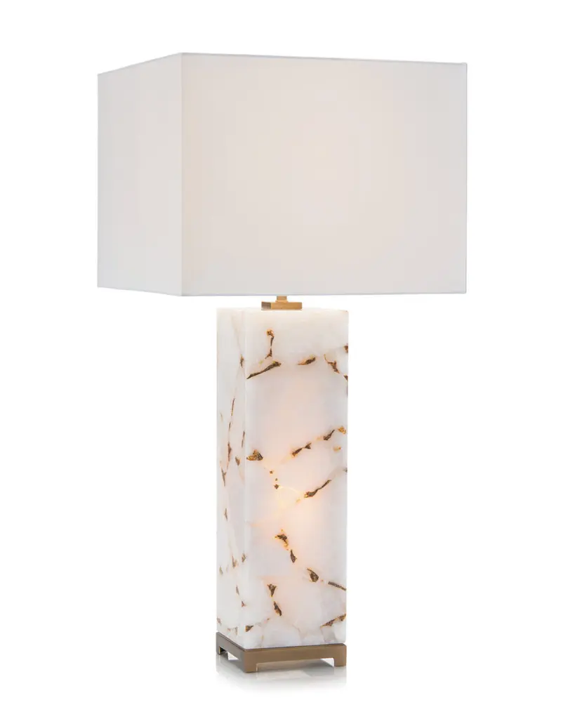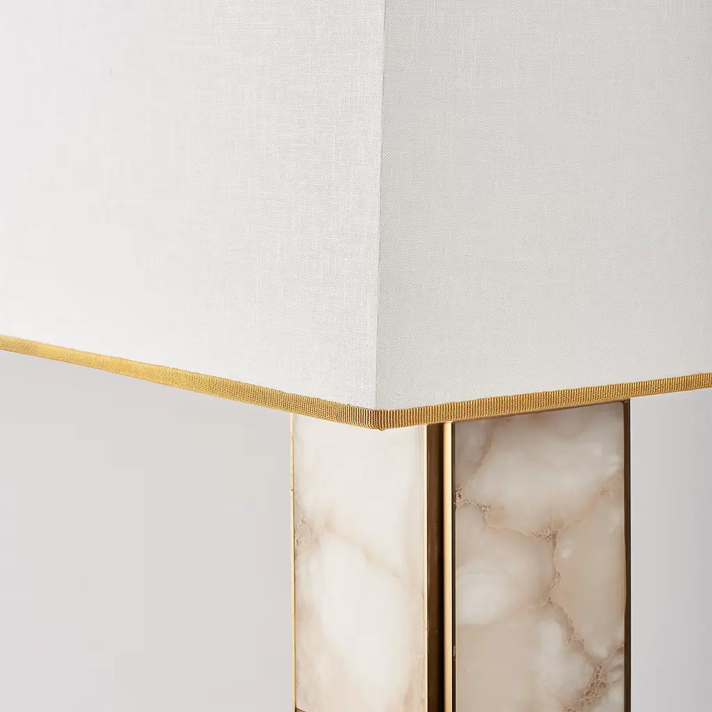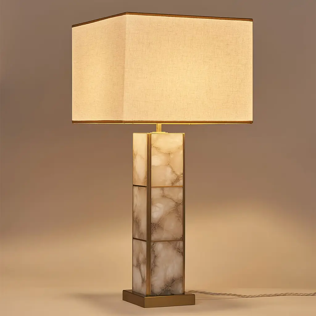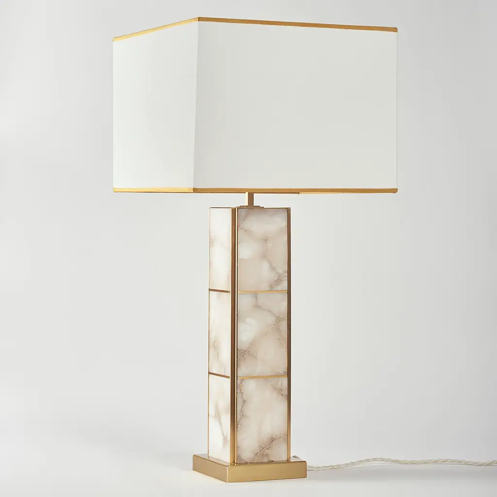 The Mole table lamp is characterized by a monolithic linear structure in brass and veined alabaster which gives it a modern and timeless aesthetic, perfect for different interior styles. Satin brass adds a touch of sophistication and warmth, while alabaster elements provide a sense of elegance and natural beauty.
