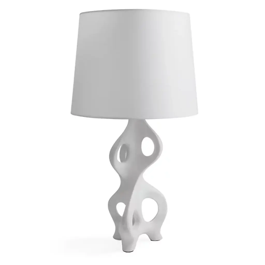 Mesmerizing like an atomic model. The eyes dot from one area to the other with the fluid, sculptural design of the Molecule Table Lamp from Jonathan Adler. The table lamp blurs the lines between art and design with mid-century modern flavor. It makes a staggering first impression at any time of day through its porcelain base. This porcelain base wraps over itself in sweeping curves and perforations. Perched above, a paper shade in a classic drum shape serves up a warm, atmospheric glow.