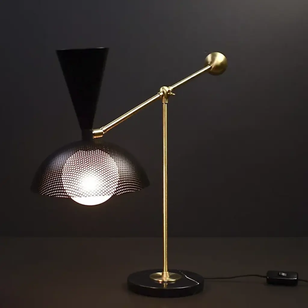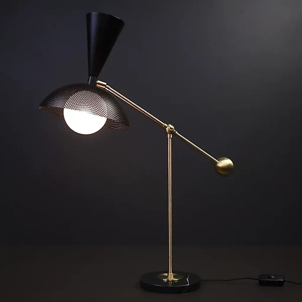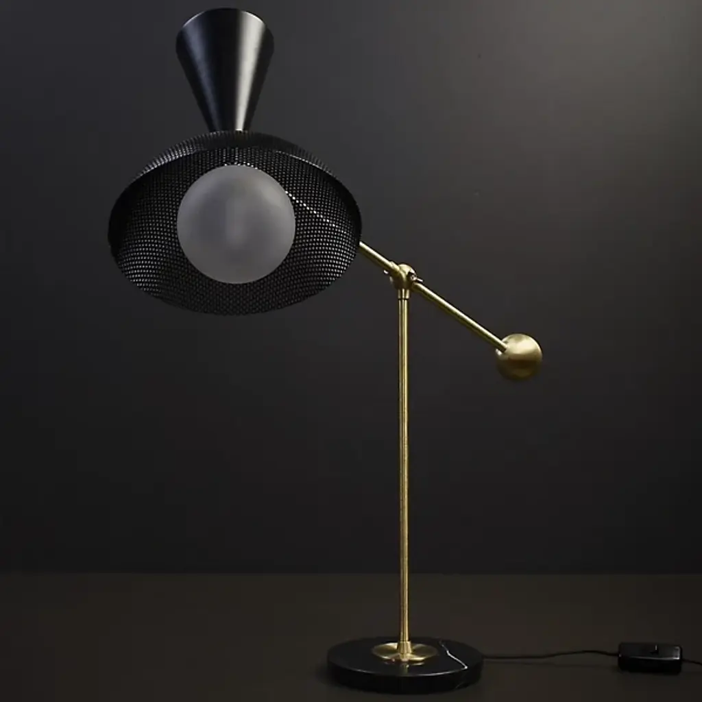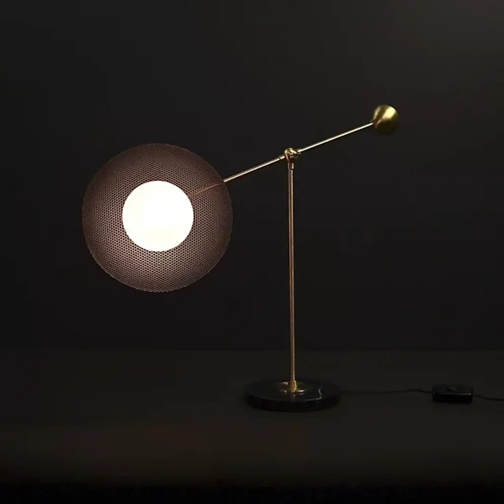 The Molto Table Lamp from Blueprint Lighting anchors its presence with a substantial circular marble base. The perforated metal shade diffuses light while creating interesting shadow patterns. Two adjustment points - an arm joint with a locking mechanism and shade swivel - provide precise light control. Made in the USA, this lamp includes a practical inline switch for easy operation. The counterweighted design balances function with Italian modernist influences, while the brass details and mesh shade add textural depth to any space.