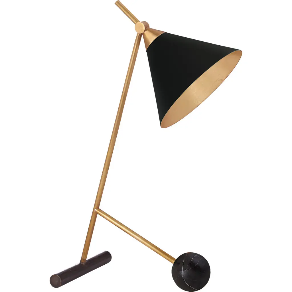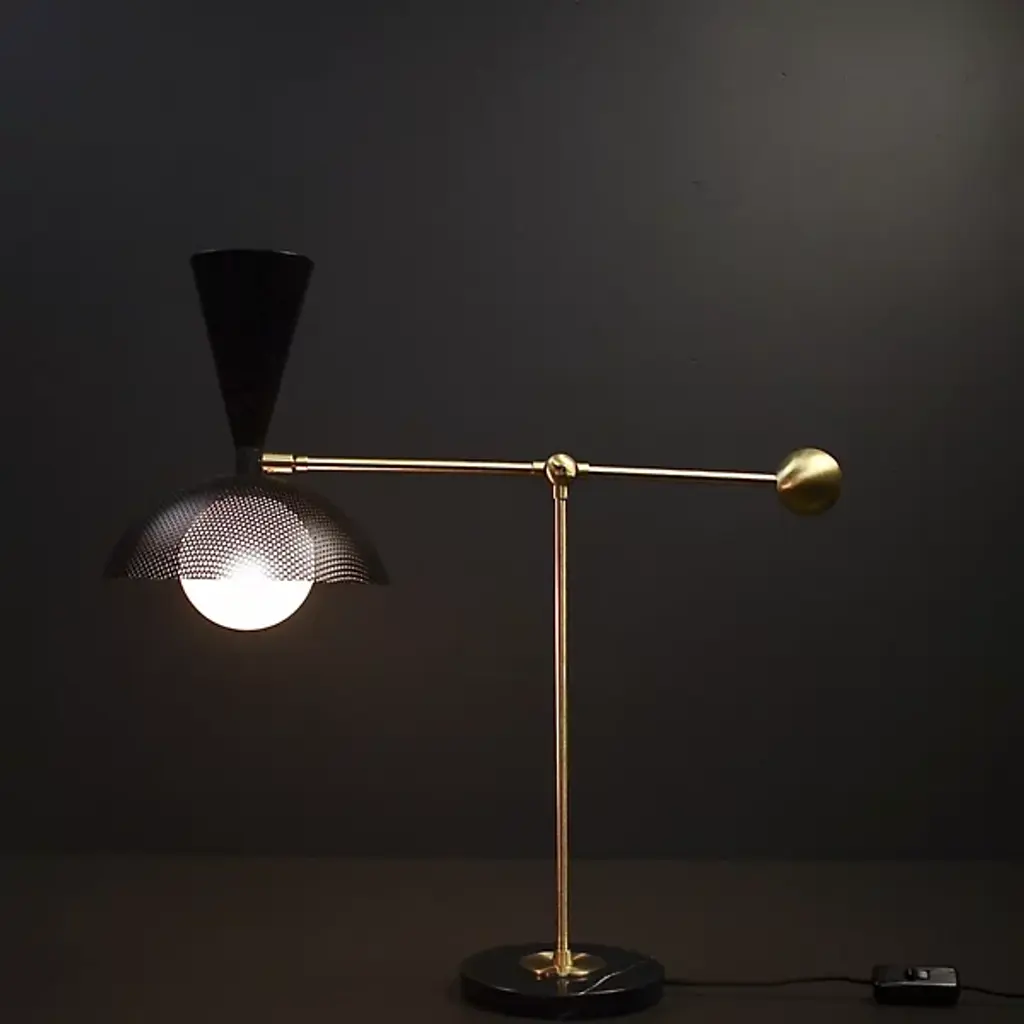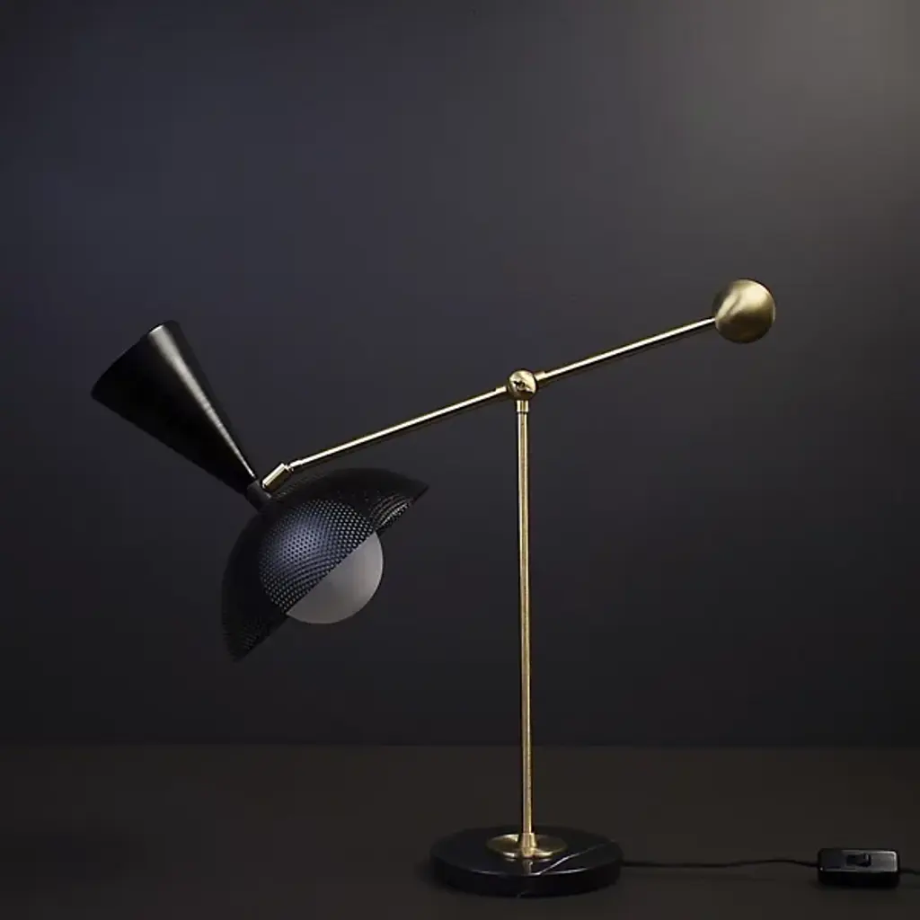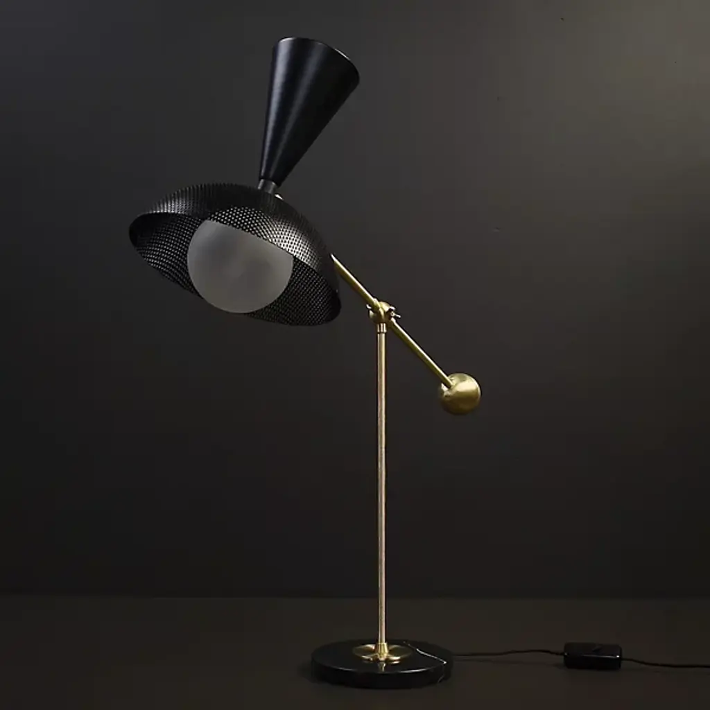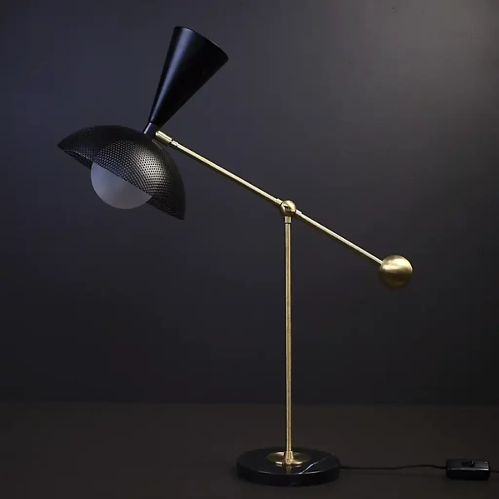 The Molto Table Lamp from Blueprint Lighting anchors its presence with a substantial circular marble base. The perforated metal shade diffuses light while creating interesting shadow patterns. Two adjustment points - an arm joint with a locking mechanism and shade swivel - provide precise light control. Made in the USA, this lamp includes a practical inline switch for easy operation. The counterweighted design balances function with Italian modernist influences, while the brass details and mesh shade add textural depth to any space.