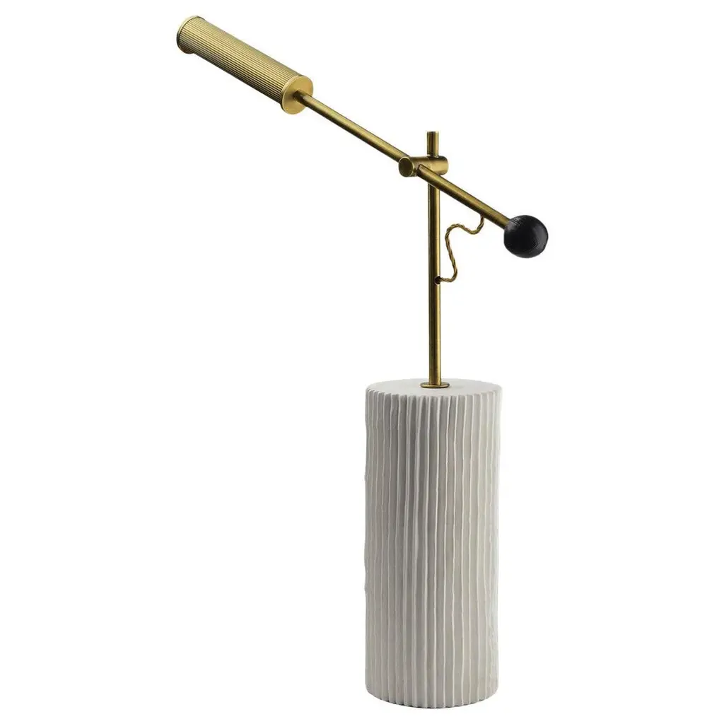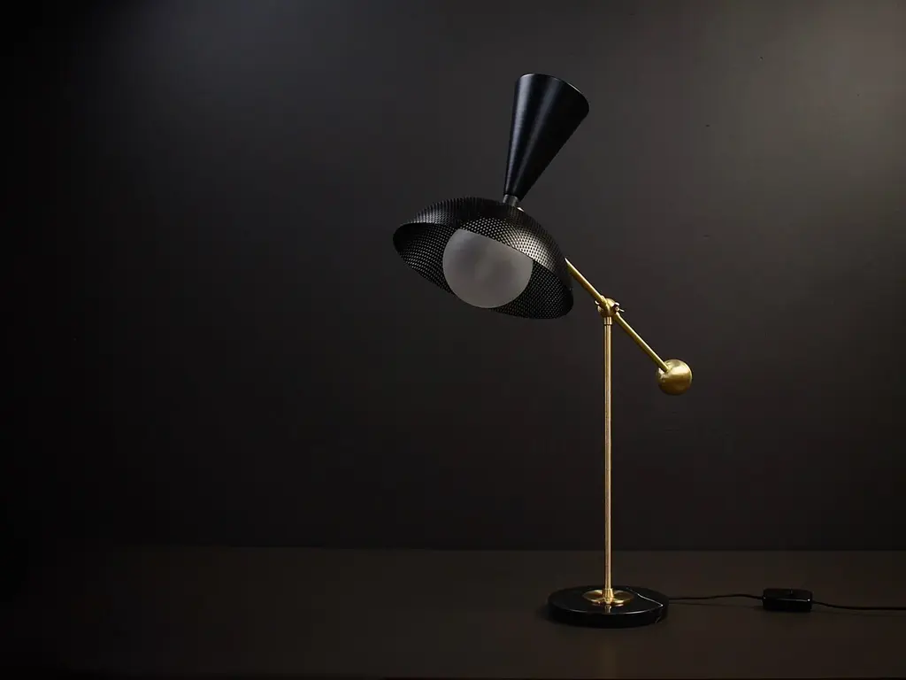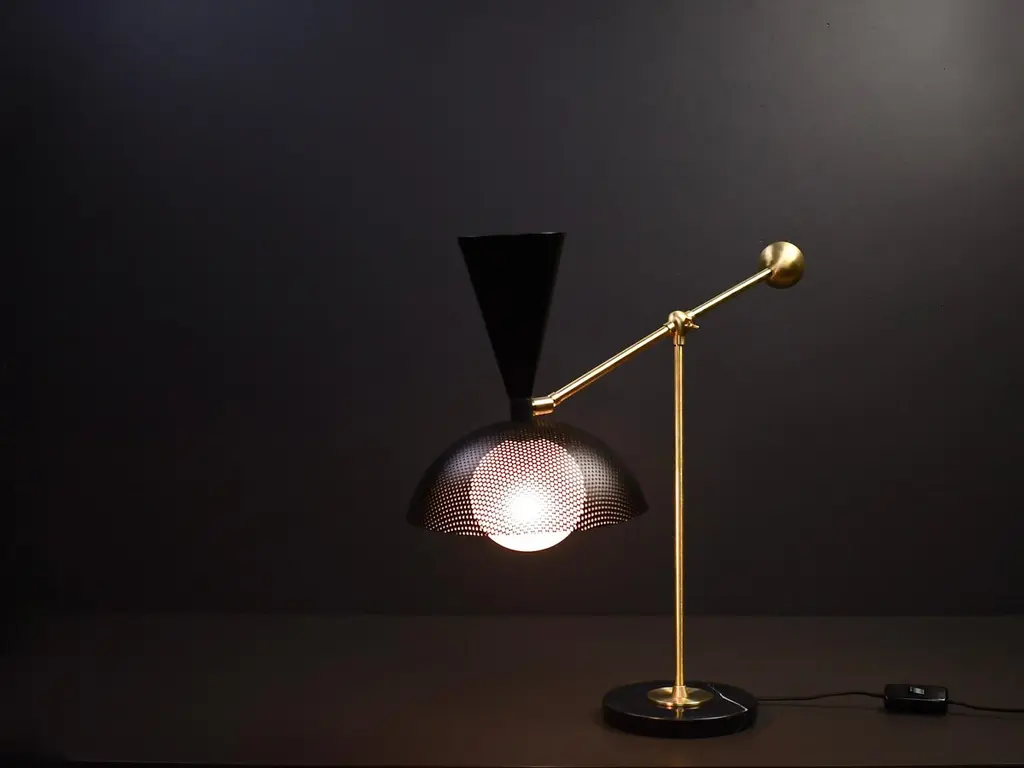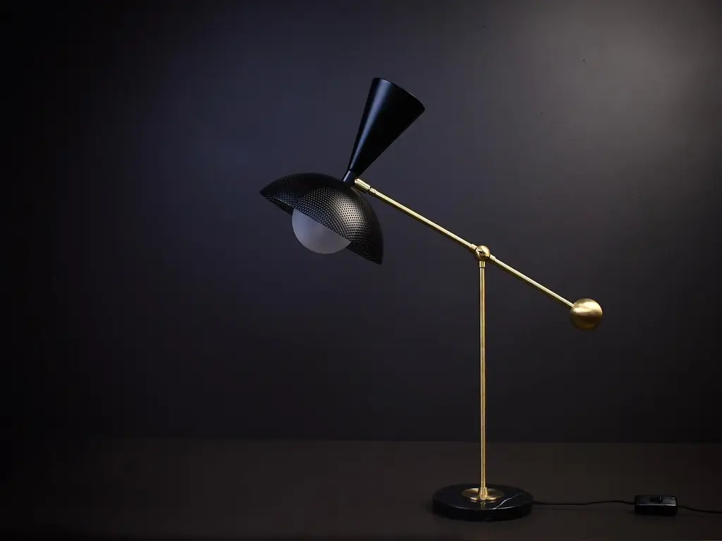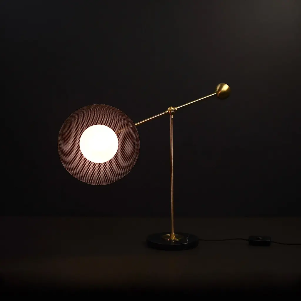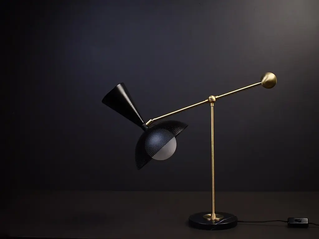 The Molto table lamp or desk lamp is a fresh, new take on Italian modernism, featuring a spun metal mesh shade, brass counterweight and a heavy black marble base. This lamp articulates in two places: the arm joint moves up and down and has a locking mechanism and there is a swivel mechanism behind the shade. This light has an inline switch on the cord.The fixture’s silhouette effortlessly makes a statement with an added bit of texture in spaces of every variety, from hospitality to residential. The Molto lamp is shown in our Natural Brass and Black enamel, but may also be specified in any of our 6 in-house metal finishes and 36 in-house enamel colors. Designed in 2020 by Blueprint Lighting.Specs: uses 1x G9 socket (halogen-style socket with 2 pins).We recommend G9 LED bulbs: 5w LED with 60 watt equivalent. Bulb included. UL listedBody dimensions: 21" D x 8" W x 25" H. Shade is 8" diameter.
