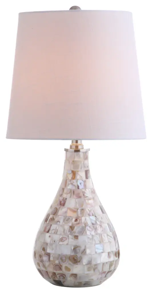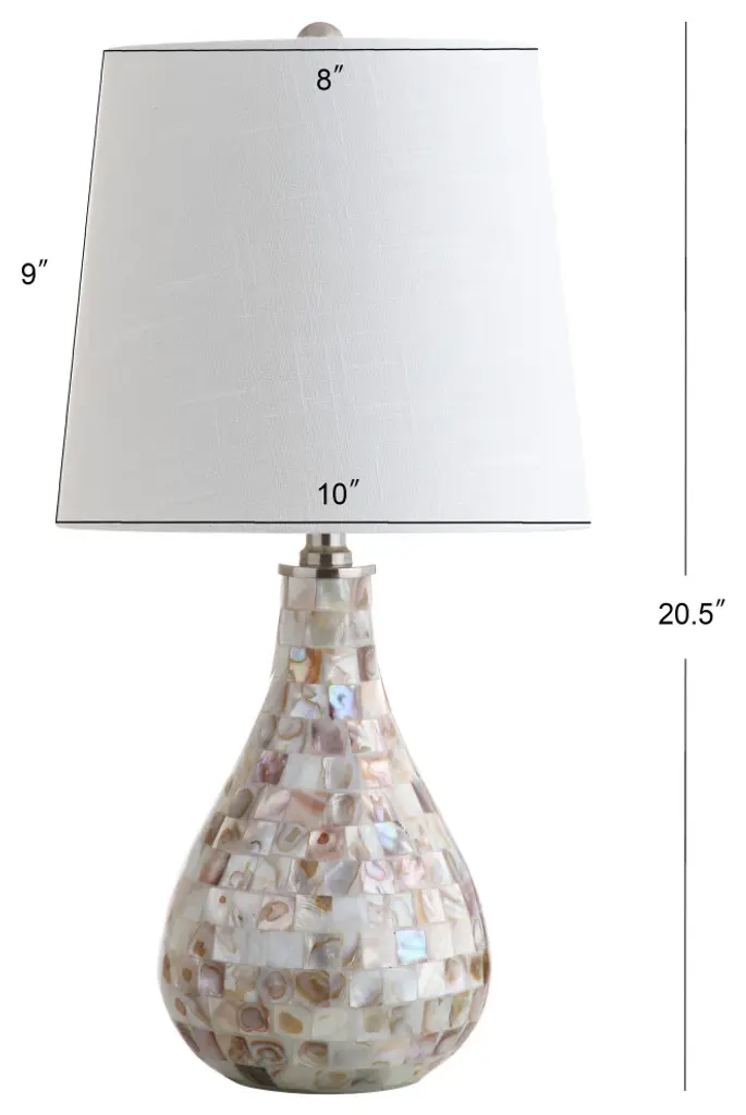 The refined teardrop shape of this seashell-embellished table lamp creates a modern take on this coastal classic. With a mosaic made from the pearlescent interiors of collected seashells, the mother-of-pearl type finish on this gorgeous base simultaneously emotes seaside glamour and luxe living. If your room needs a touch of refinement and the warm glow of a perfectly scaled 20.5" table lamp then you cannot go wrong with this beautiful piece. -Seashell-embellishment on the base creates a luxe look on an otherwise modern shape-Classic white drum shade in a hardback cotton material-Clear 60" cord with standard USA 2-prong plug -On-off switch on socket-Takes one maximum 40 watt or equivalent bulb-Eco-friendly 4W LED bulb included-UL Listed-Color: Seashell with white shade-Body Material: Resin /Seashell-Base Material: NA-Finial Material: Plastic-Finial Color: Chrome-Harp Color: Silver-Includes: One (1) lamp(s)-Minor Assembly Required-Lamp: 20.5 inches high x 10 inches wide x 10 inches deep-Shade: 9 inches high x 10 inches wide x 10 inches deepYou see a lamp.We see a decorative work of art.A perfectly curved shade casts a dramatic shadow on a floor. LED lightbulbs: as easy on the environment as they are on the eyes. The JONTHAN Y Lighting collection considers every detail from impeccably sourced materials to designer styling. And our prices are so attractive, we''ve transformed a functional necessity into a fashion accessory.JONATHAN Y Lighting - a fashion revolution in home decor.
