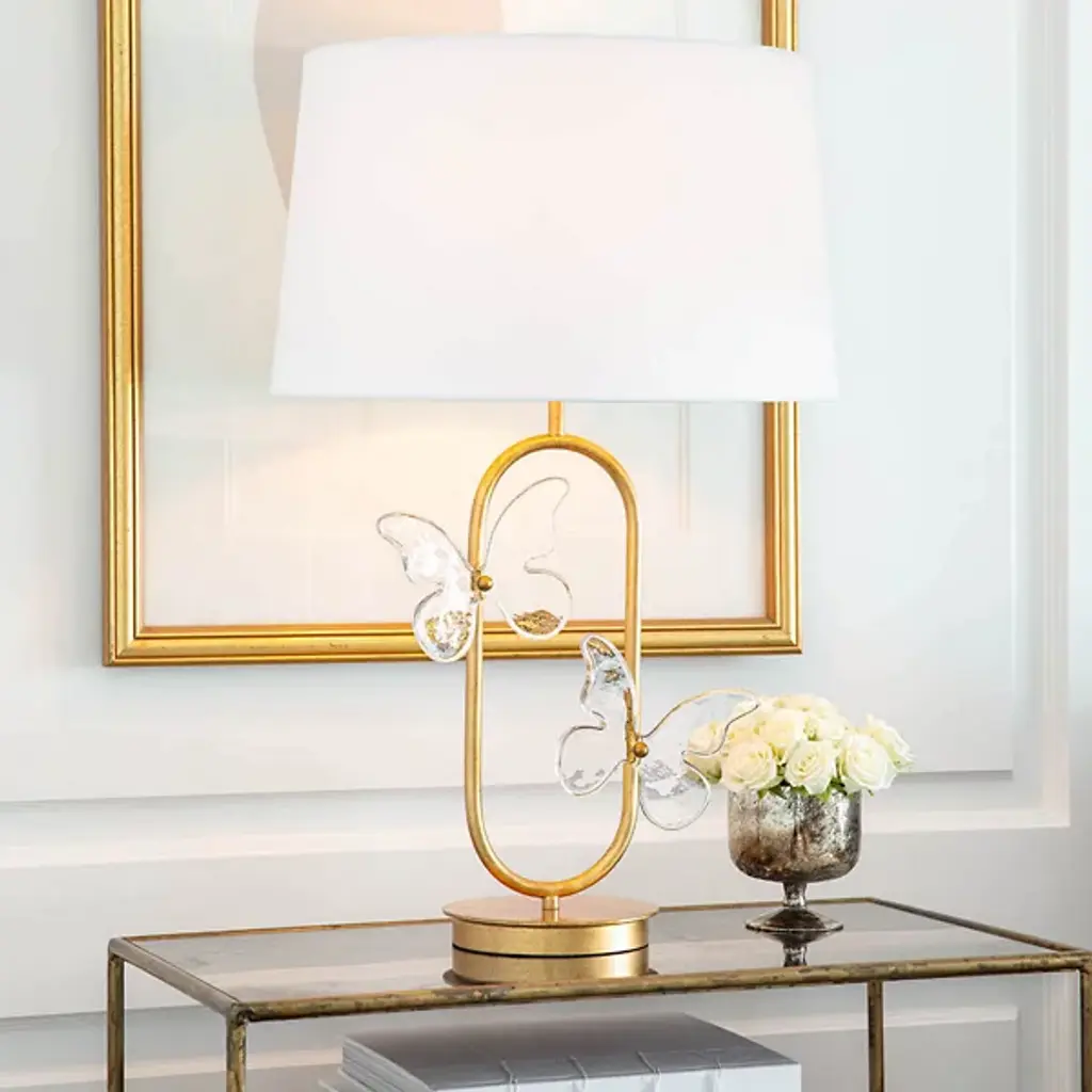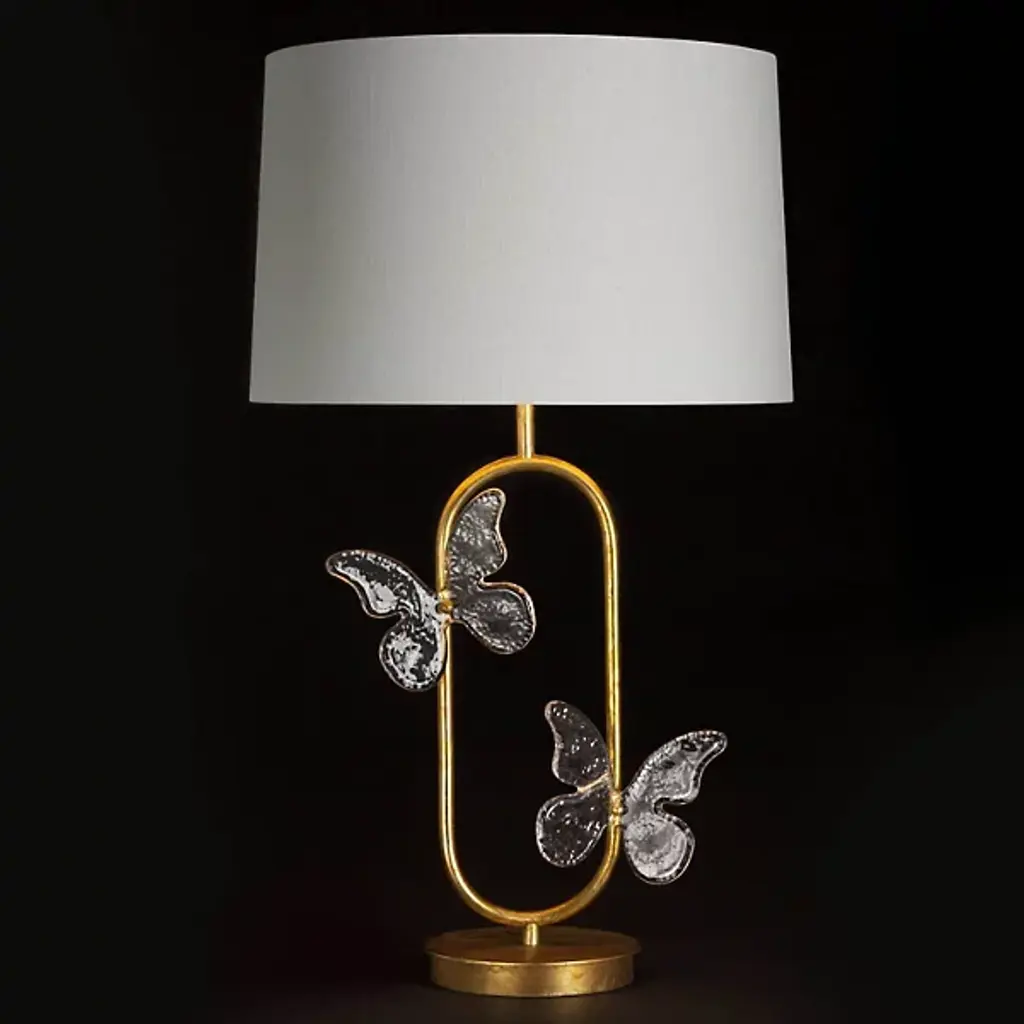 The Monarch Oval Table Lamp by Regina Andrew matches a beautiful pair of glass butterflies with a simple yet stunning build. A round base supports an openly styled, oval frame that these glass accents are perched upon, lending an artful touch to this lamp base as it holds a crisp linen shade above its form. Filtering an even layer of light onto surroundings, the butterflies that give this lamp its name playfully capture the illumination from above them, lending a whimsical touch to rooms.