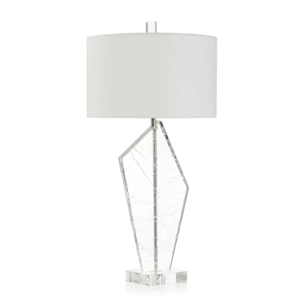 The Monolith Table Lamp features a gorgeous, asymmetric body of crystal that showcases sharp angles and artistic striations that elevate the piece into a textural marvel. The lamp rests gently on a square crystal base with a crystal final adorning the top, making the piece almost completely transparent. A neck of iron with a Polished Nickel finish provides playful contrast and adds a touch of modernity to this beautiful statement piece.