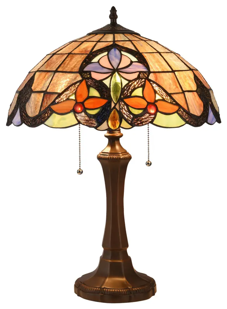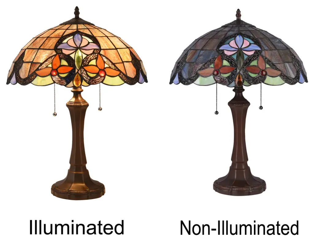 Monroe is a traditional style 2 light table lamp featuring soft pastel colored stained glass. Each shade is hand crafted, using the same methods developed by Louis Comfort Tiffany in the early 1900''s. This process entails using 225 hand cut stained art glass pieces and 9 glass beads, each wrapped in fine copper foil and soldered together at extremely high temperatures to form each unique piece. Exact size to the nearest inch may vary, and exact color of each glass piece may vary due to each piece being hand crafted. First image is with the light shining through, second image is with no light. Dry listed and recommended for an indoor setting.