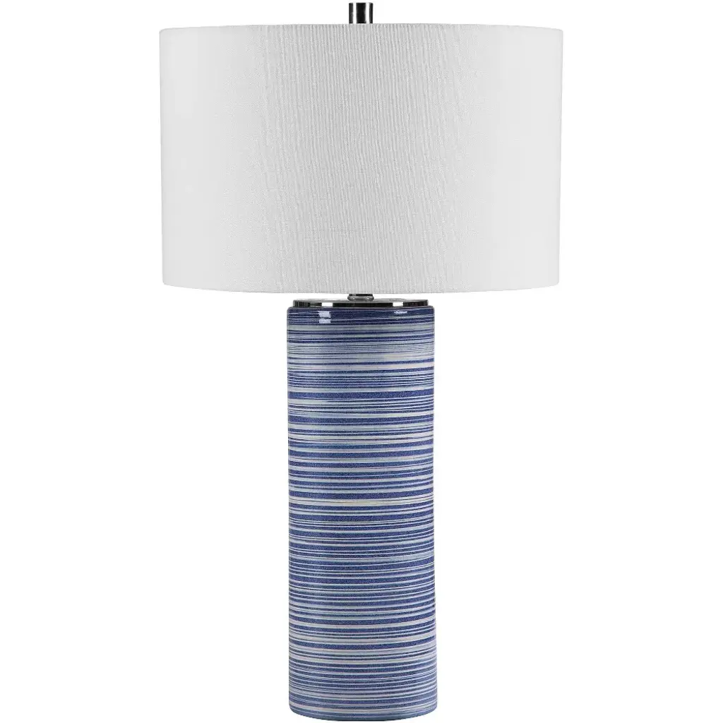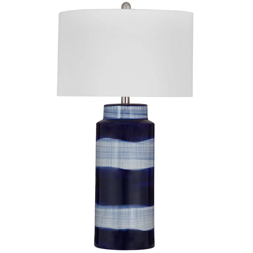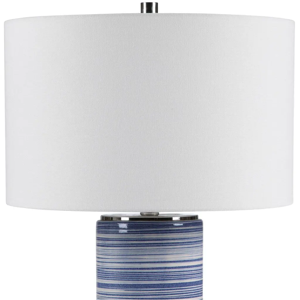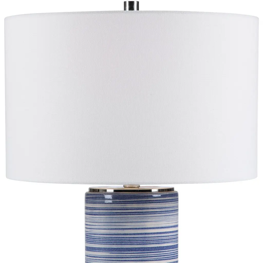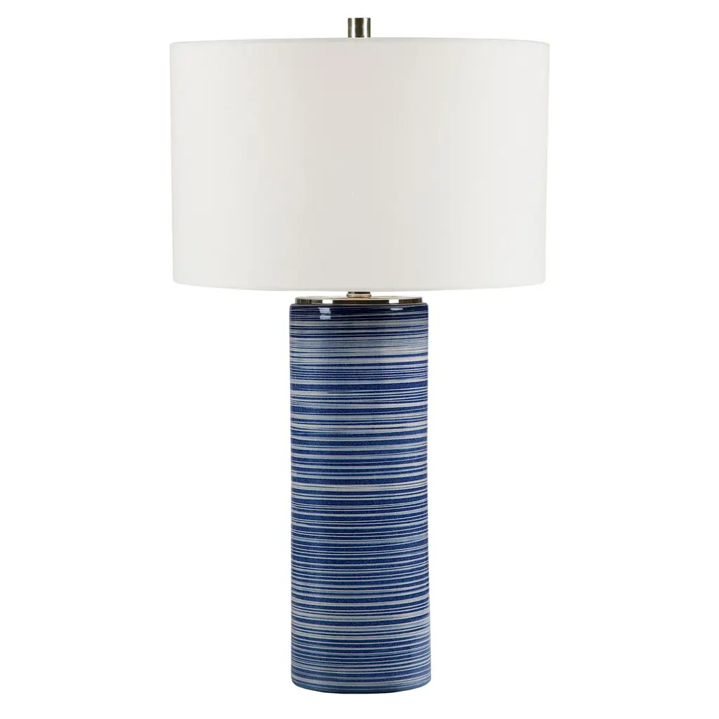 Showcasing Trendy White And Indigo Hues, This Ceramic Table Lamp Has A Striped Glaze With Polished Nickel Accents. The Round Hardback Drum Shade Is A White Linen Fabric.