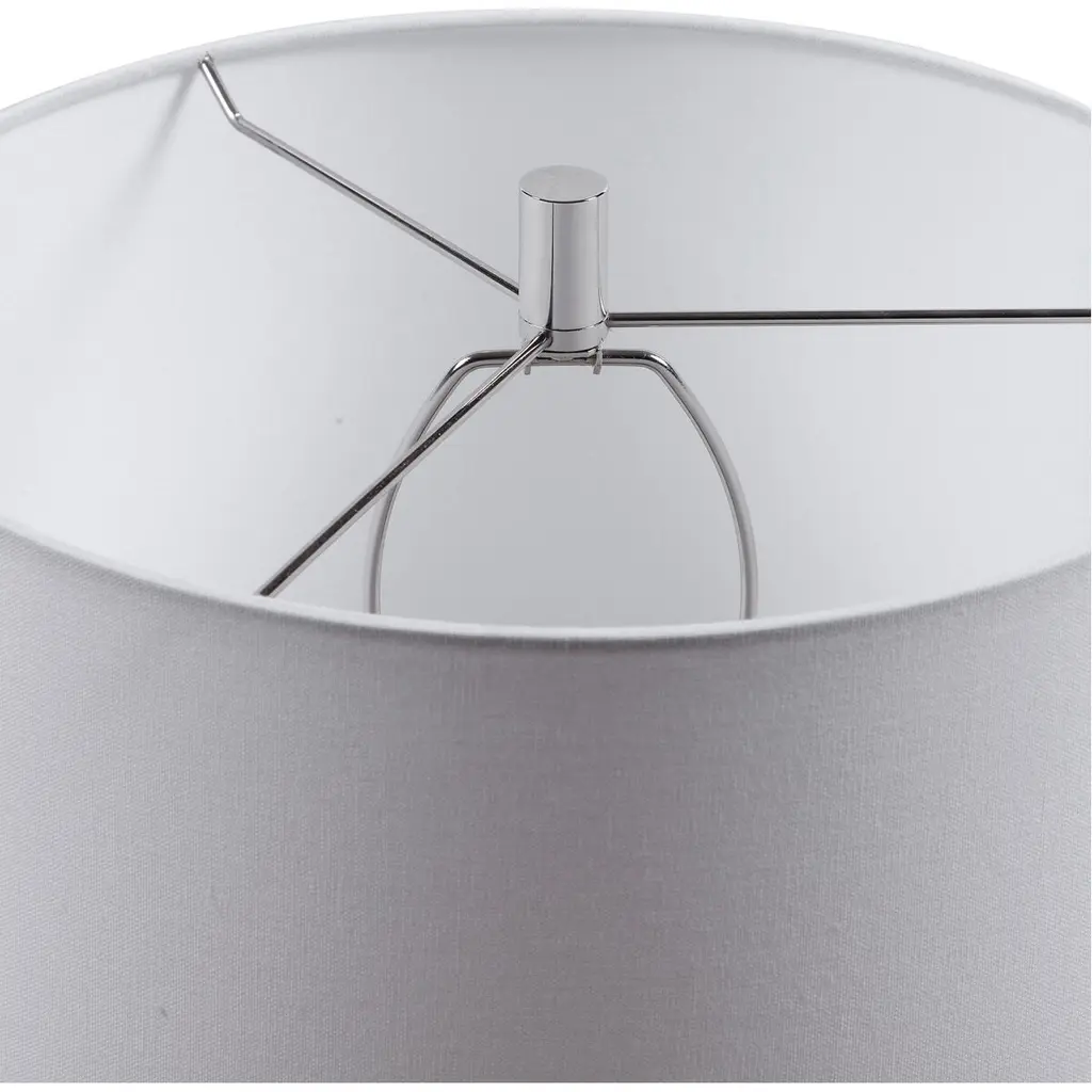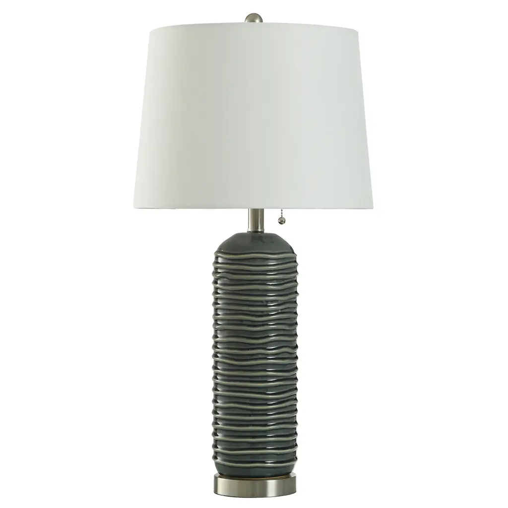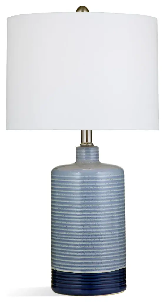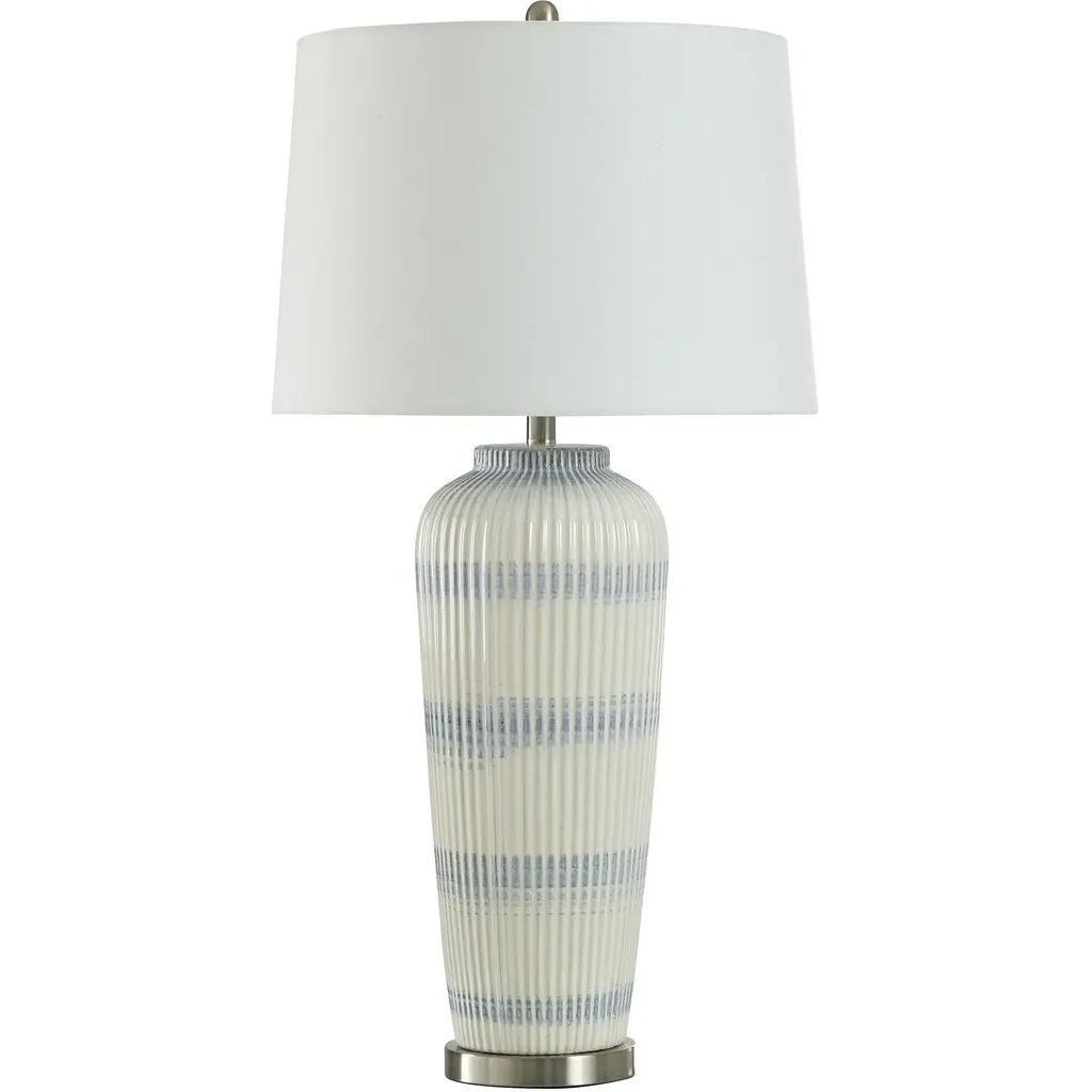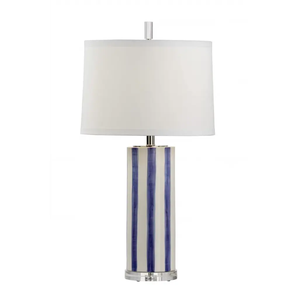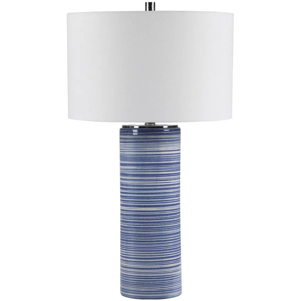 Showcasing Trendy White And Indigo Hues, This Ceramic Table Lamp Has A Striped Glaze With Polished Nickel Accents. The Round Hardback Drum Shade Is A White Linen Fabric.
